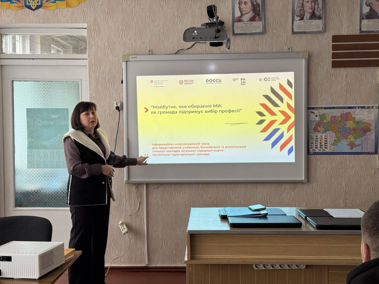 як громада підтримує вибір професії” в рамках національного пілотування системи профорієнтації дітей і підлітків, що реалізується Швейцарсько-українським проєктом DECIDE у партнерстві з Міністерством освіти і науки України, обласними військовими адміністраціями, органами місцевого самоврядування, закладами освіти та роботодавцями.