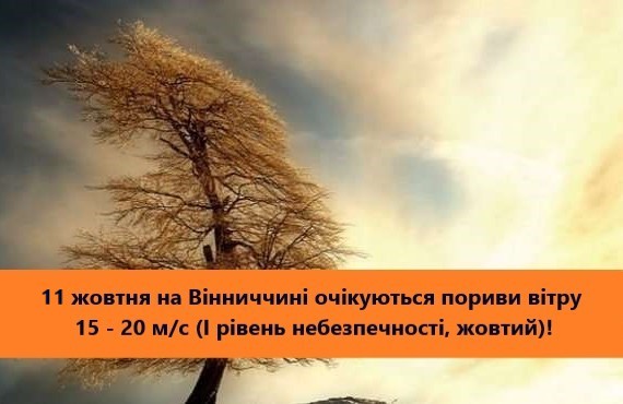 ❗️💨🌬🍂🍁 11 жовтня на території Вінницької області очікується ускладнення погодних умов, що відповідає I рівню небезпечності, жовтий!