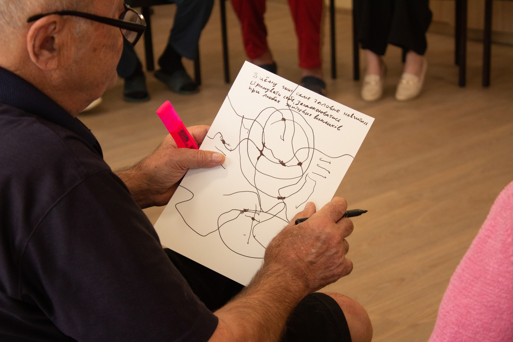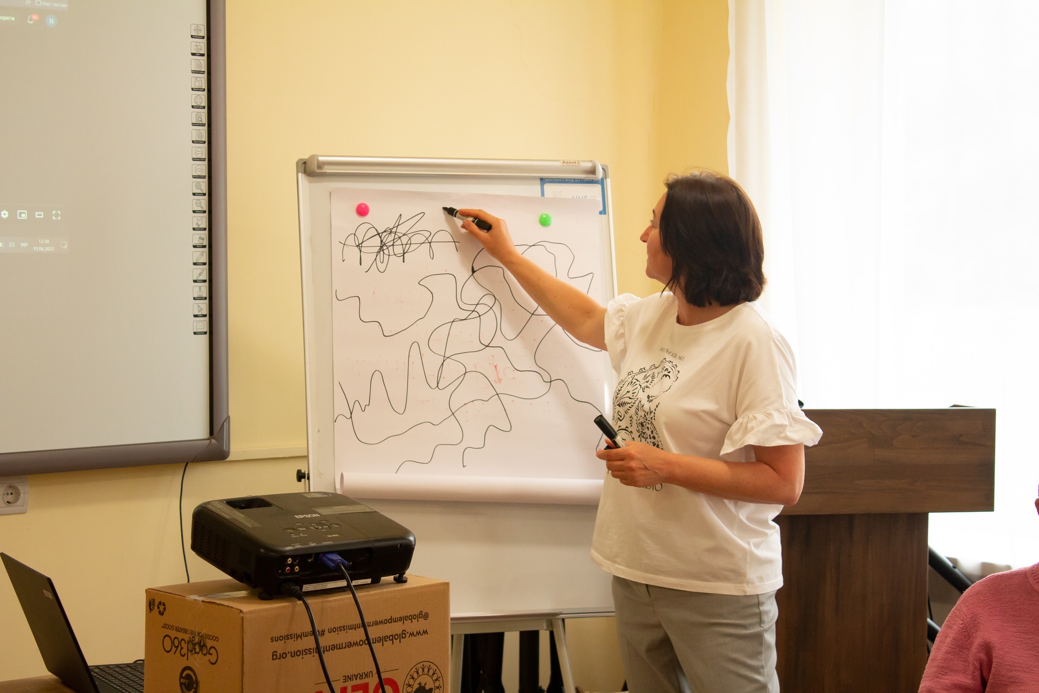 У другій, не менш важливій частині тренінгу, відбулася унікальна арт-терапевтична сесія під назвою «Нитка до себе», де використовувалася техніка нейрографіки. За допомогою малювання плавних ліній і творчої роботи з різноманітними кольорами, учасники змогли встановити глибший контакт із власним внутрішнім світом, чітко усвідомити свої внутрішні запити та пережиті емоції. Цей метод допоміг їм виразити свої почуття та знайти нові способи самовираження.