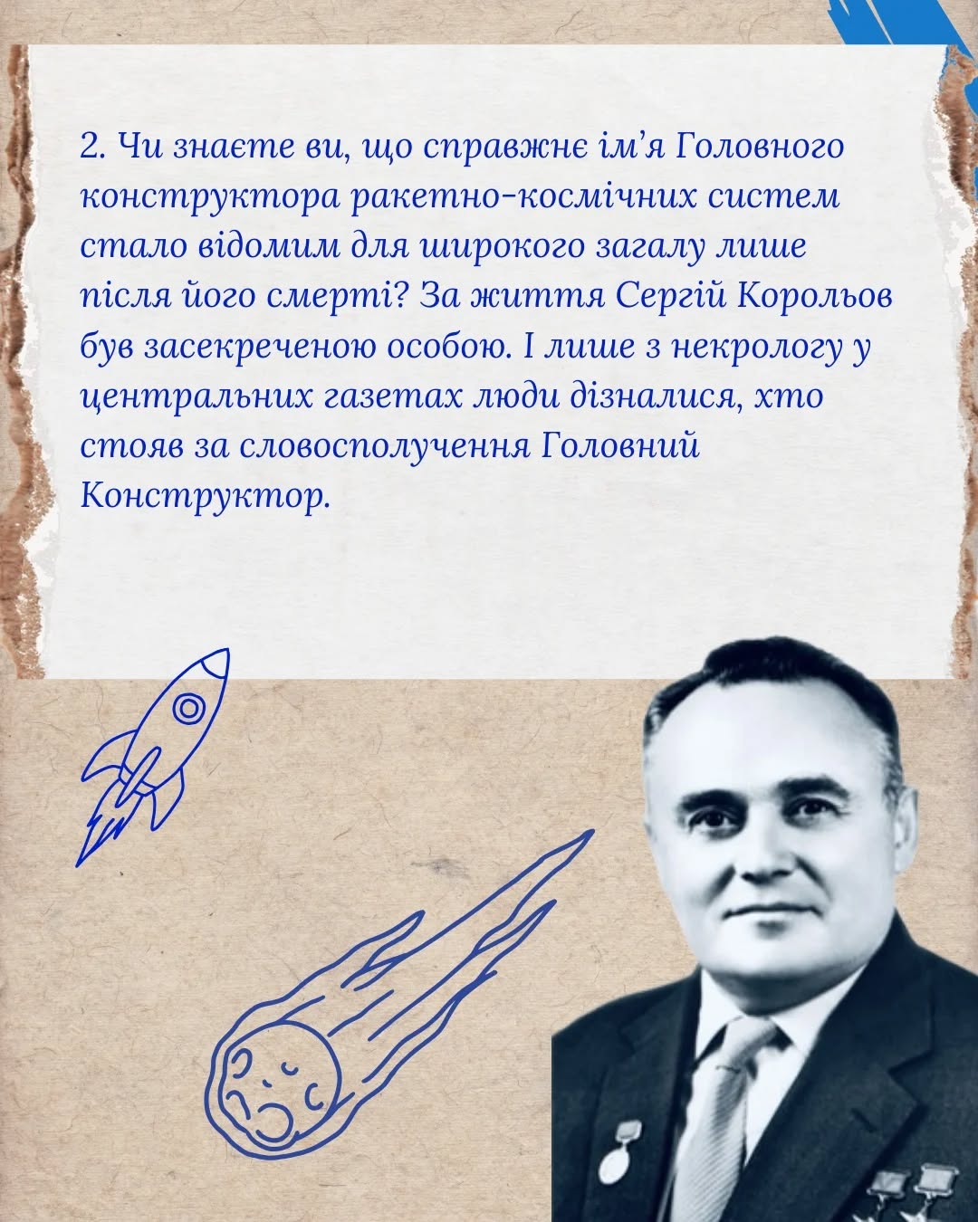 Під його керівництвом було здійснено запуск першого штучного супутника Землі, проведено перші дослідження Місяця, Венери та Марса, а також відкрито шлях до пілотованих космічних польотів — у космос вирушили перші космонавти планети Земля. Наукова та інженерна спадщина Сергія Корольова стала фундаментом розвитку світової космонавтики й визначила подальший напрям освоєння космічного простору.