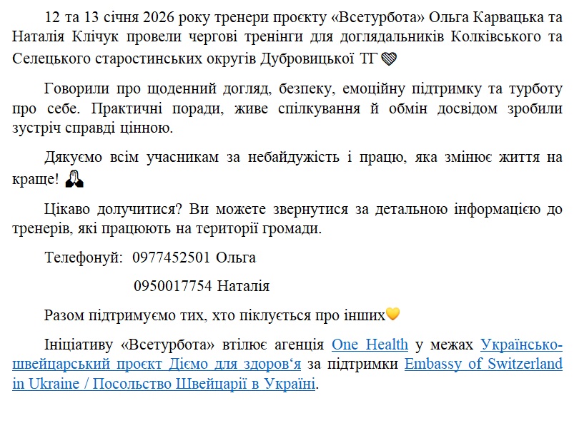 12 та 13 січня 2026 року тренери проєкту «Всетурбота» Ольга Карвацька та Наталія Клічук провели чергові тренінги для доглядальників Колківського та Селецького старостинських округів Дубровицької ТГ💙