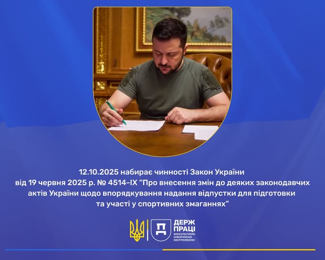 12 жовтня 2025 року набуває чинності новий Закон України від 19 червня 2025 р. № 4514-ІХ “Про внесення змін до деяких законодавчих актів України щодо впорядкування надання відпустки для підготовки та участі у спортивних змаганнях”. Цей важливий документ покликаний систематизувати та уточнити тривалість і процедуру надання відпусток для тих, хто присвячує себе спорту, готуючись до змагань або беручи в них участь.