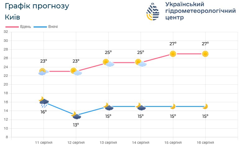 У столиці передбачаємо плавніші зміни температури: найпрохолодніша теж доба 12 серпня, надалі вночі поблизу 15°, вдень 25-27°☀️☀️☀️