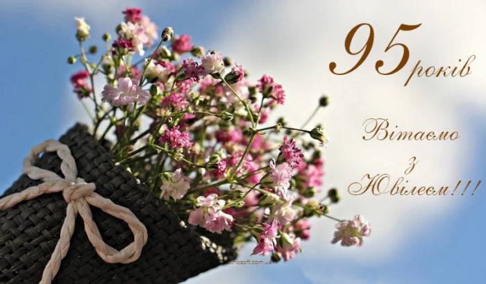 95 років — це прекрасна цифра, яка жінці додає тільки мудрості та шарму! Від щирого серця привітаємо Вас. Бажаємо, щоб Ваше здоров’я лише міцніло, а настрій був завжди сонячним. Нехай Ваш досвід та мудрість, які вилилися в роки несуть натхнення та приклад для Ваших дітей, внуків та правнуків.