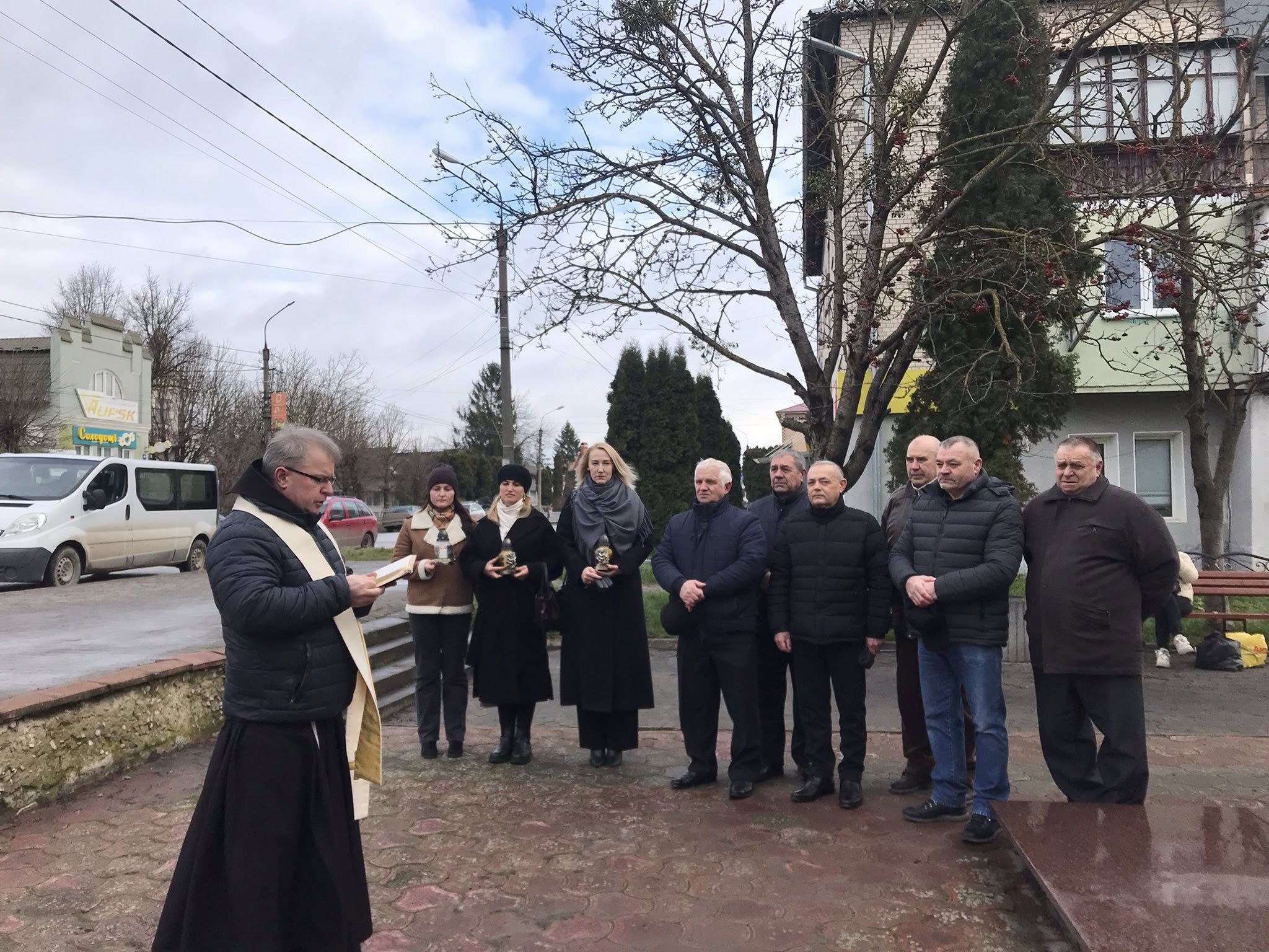 До підніжжя пам’ятного знака покладено запалені лампадки.