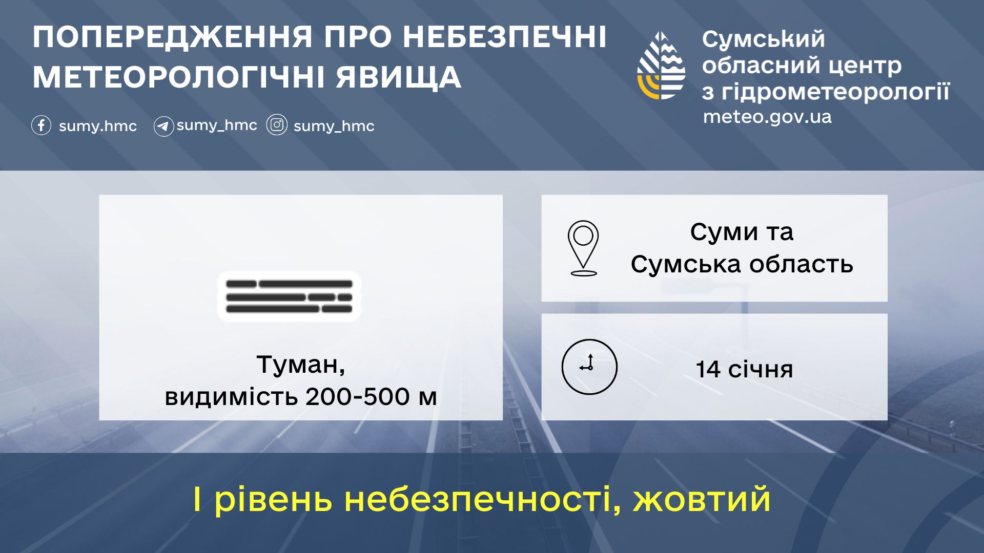 ❗️14 січня в північній половині Сумської області очікується туман, видимість 200-500 м, на дорогах збережеться ожеледиця, (І рівень небезпечності, жовтий).🟡