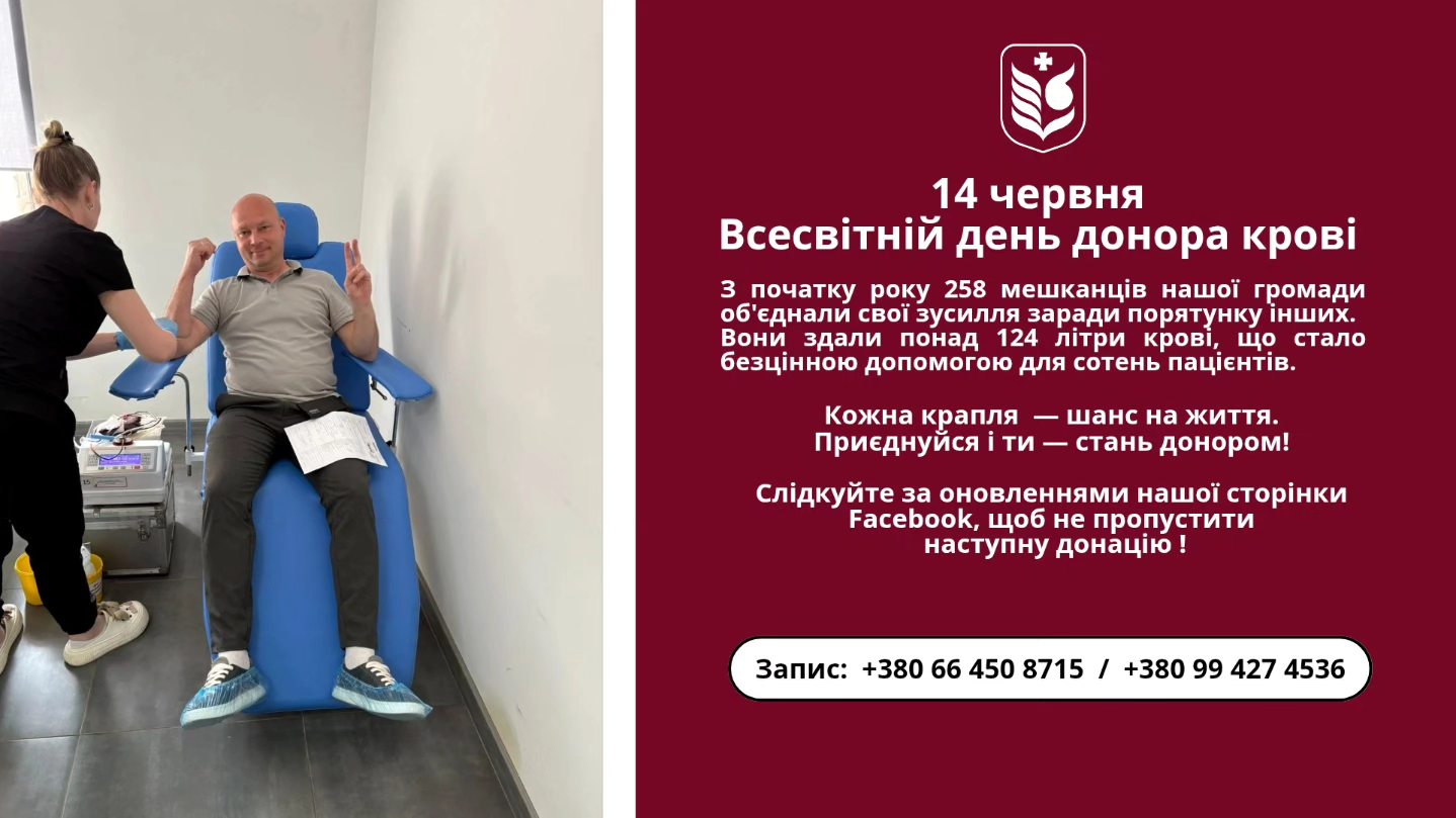 14 червня 2025 року світ відзначає Всесвітній день донора крові. Цього року наша громада може пишатися своїм внеском у порятунок життів. З початку року, неймовірні 258 мешканців об’єднали зусилля, щоб допомогти тим, хто цього потребує. Завдяки цим добрим людям, було здано понад 124 літри крові, що стало неоціненною підтримкою для сотень пацієнтів.