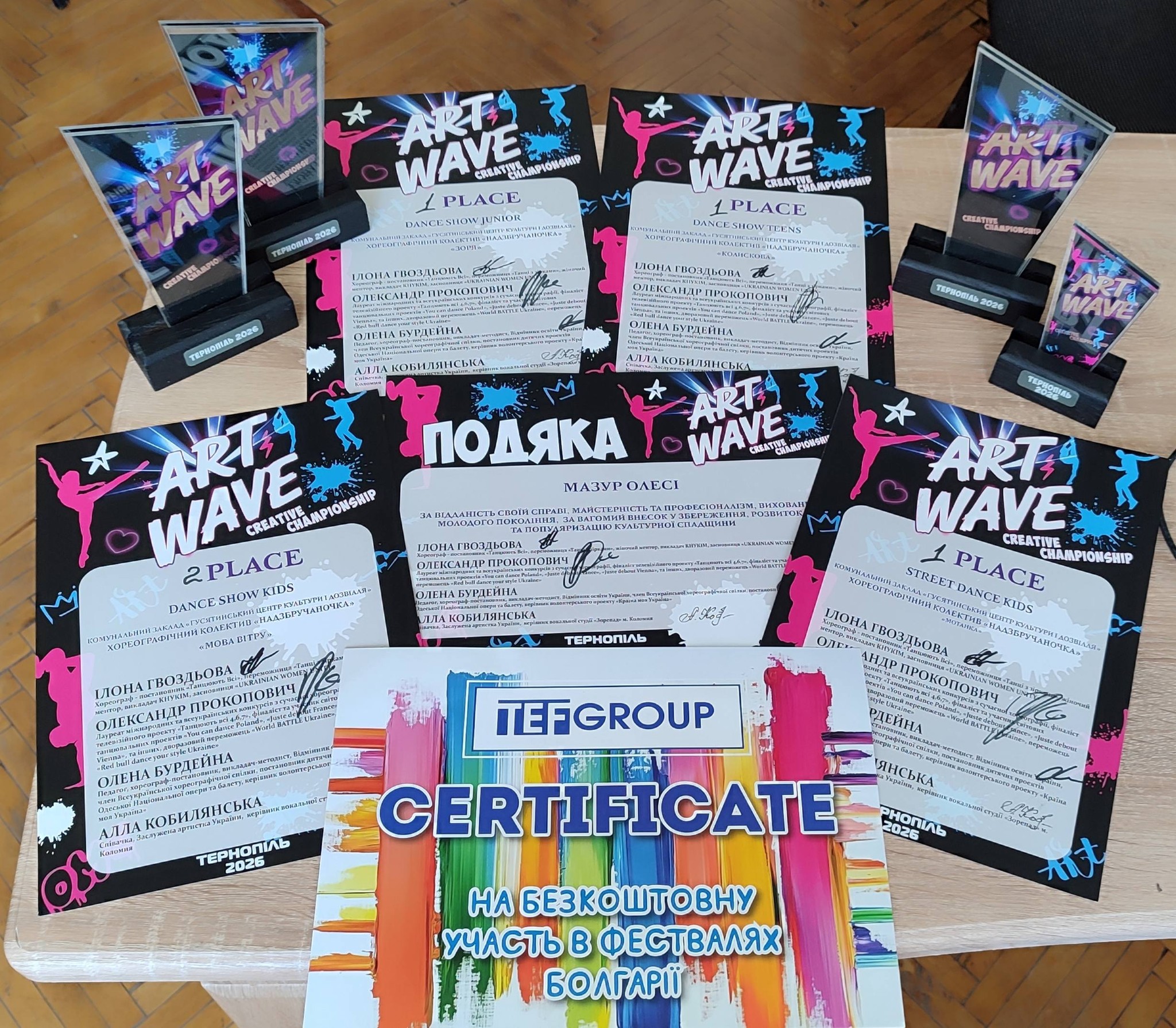 Ми щиро вітаємо наших незрівнянних танцівників та їхнього наставника, Олесю Мазур, з цими видатними досягненнями! Бажаємо вам невичерпного натхнення, нових яскравих перемог та незабутніх моментів на сцені. Нехай ваш талант продовжує сяяти!