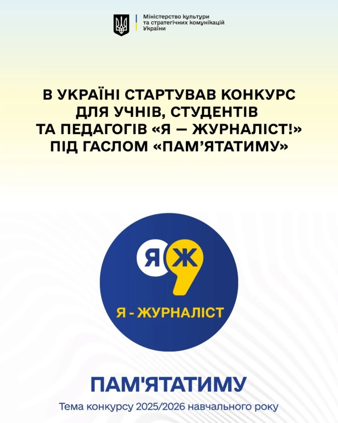 📝 15 вересня стартував ювілейний, одинадцятий Всеукраїнський конкурс творчих робіт «Я — журналіст!» 2025/26 навчального року. Цьогоріч він проходитиме під зворушливим гаслом «Пам’ятатиму».