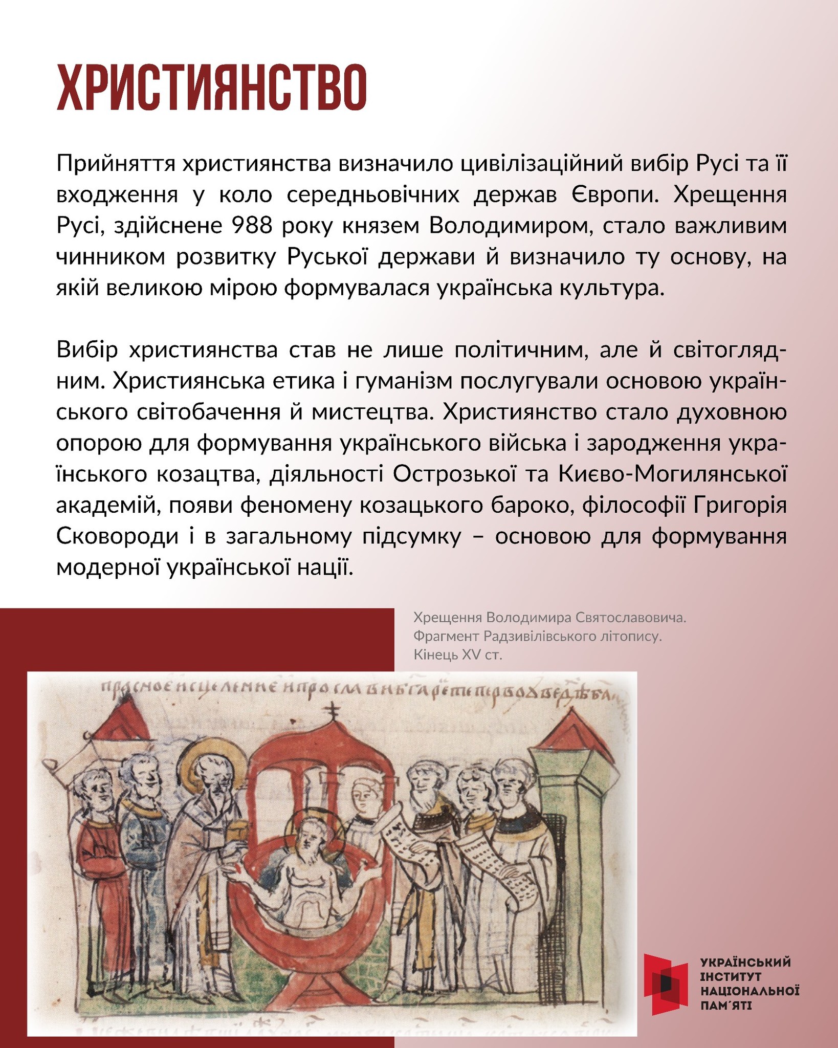 Прийняття князем Київським Володимиром у 988 році християнства стало для України цивілізаційним вибором. Воно сприяло піднесенню культури й освіти, дало поштовх розвитку кириличної писемності.