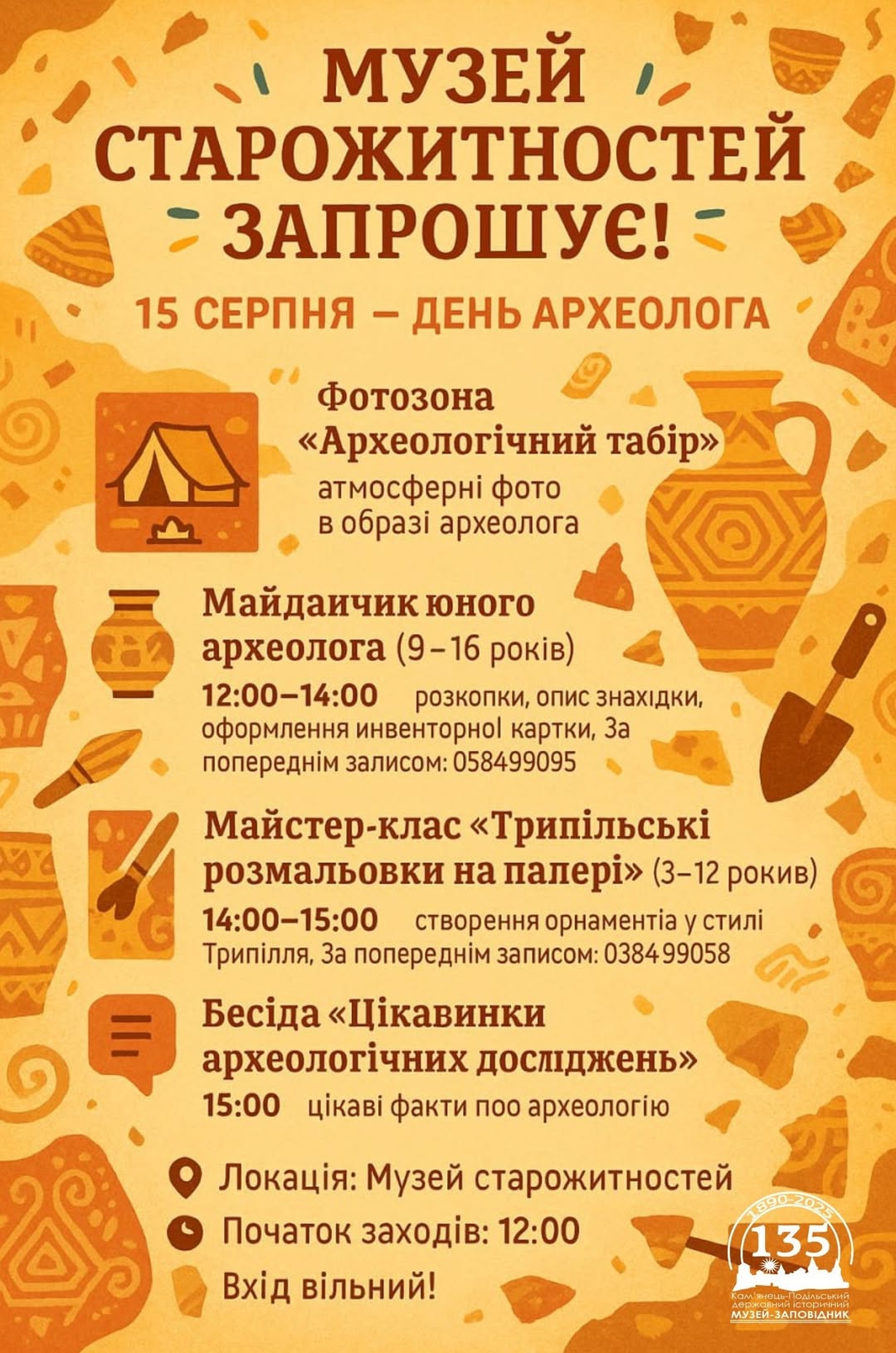 Вхід вільний! Запрошуємо приходити з родиною, друзями або просто з гарним настроєм, щоб разом зануритися у світ давнини та історії нашого краю.