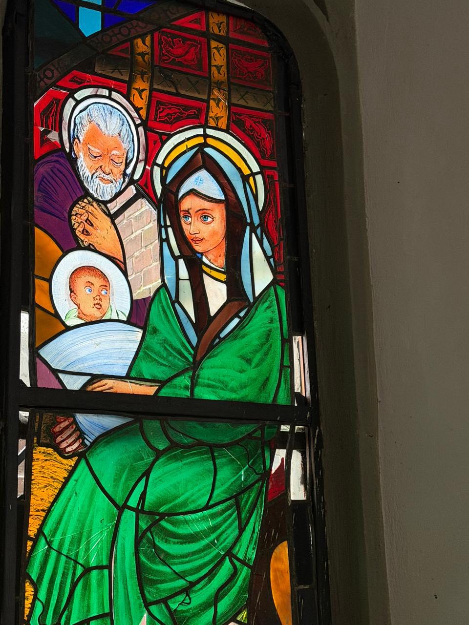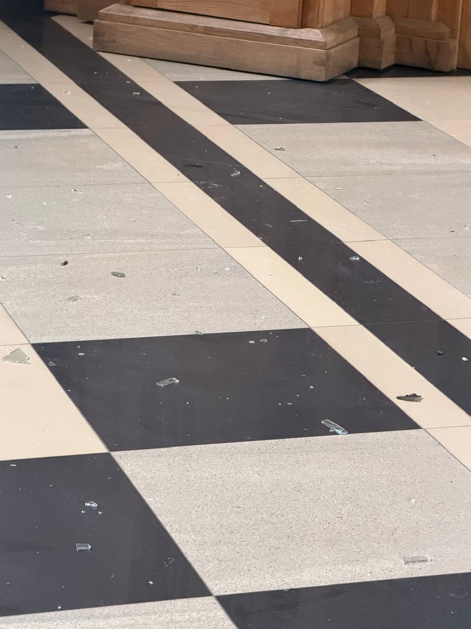 Пошкоджені вітражі авторства Валерія Шаленка у церкві (на фото), а також віконні заповнення у будівлі школи.