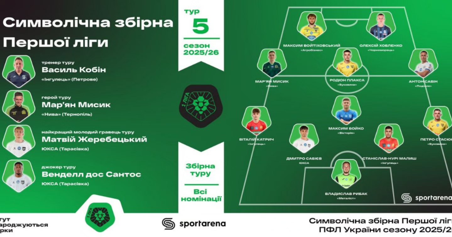🚨Збірна 5-го туру Першої ліги від SportArena. 🔸️Тренер туру – Василь Кобін (Інгулець) 🔸️Гол туру – Сергій Кисленко ( Інгулець ➡️ Ворскла) Герої туру – Станіслав-Нурі Малиш та Віталій Катрич