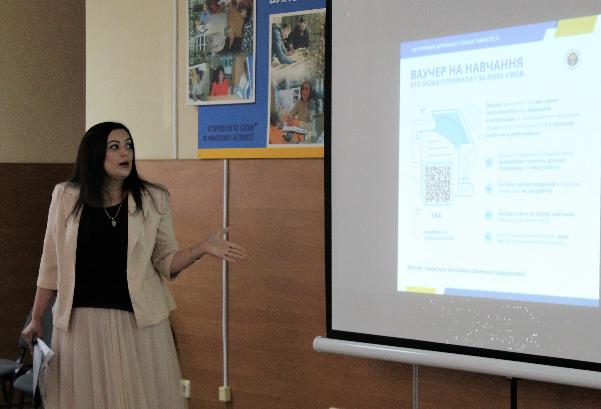 Ольга Бондаренко, в.о.начальника Біляївського відділу Одеської філії Одеського обласного центру зайнятості відкрила захід та презентувала послуги державної служби зайнятості, ДНЗ Одеського центру ПТО, підтримання конкурентоспроможності учасників бойових дій та осіб з інвалідністю внаслідок війни шляхом професійного навчання в закладах професійної (професійно-технічної) освіти Державної служби зайнятості, отримання ваучера на навчання.