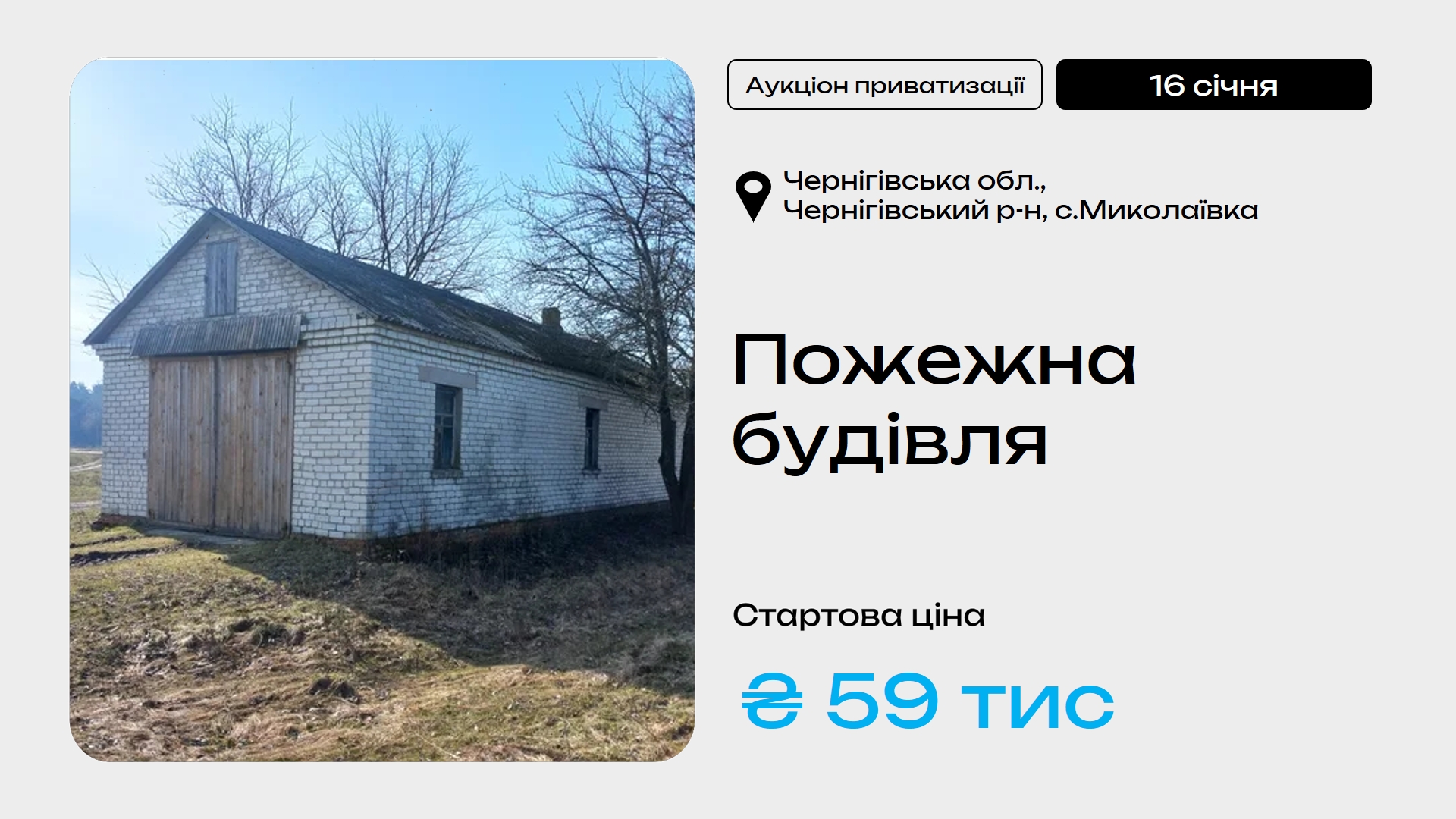📌 16 січня Фонд держмайна запрошує взяти участь у приватизаційному аукціоні пожежну будівлю загальною площею 81,3 м² у с.Миколаївка Чернігівського району.