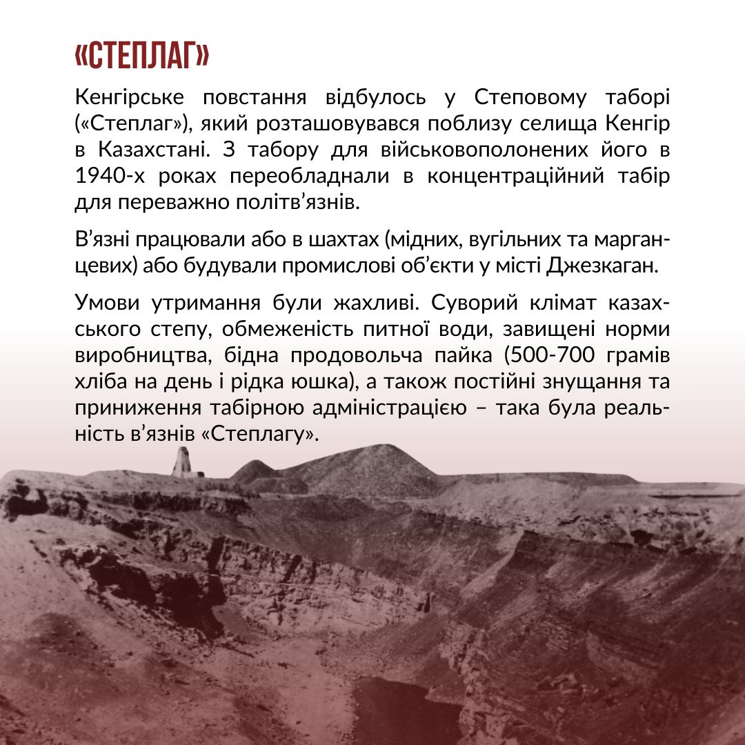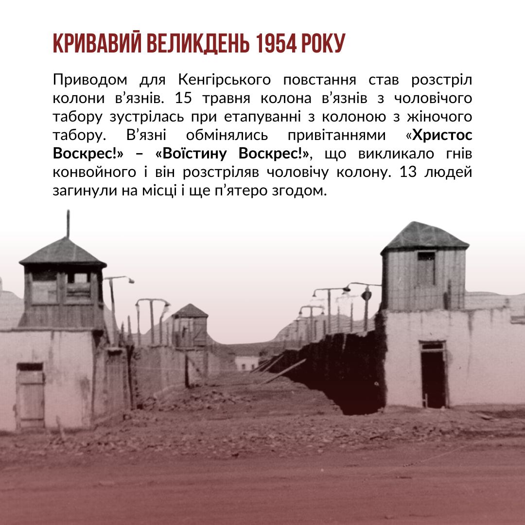 16 травня відзначається 71-ша річниця Кенгірського повстання – масштабного виступу політичних в’язнів у Степному таборі ГУЛАГ, що знаходився в Казахстані. Радянська влада не могла придушити цей бунт, поки не застосувала армію та танки. Одним із найважливіших наслідків Кенгірського повстання став демонтаж системи ГУЛАГ.
