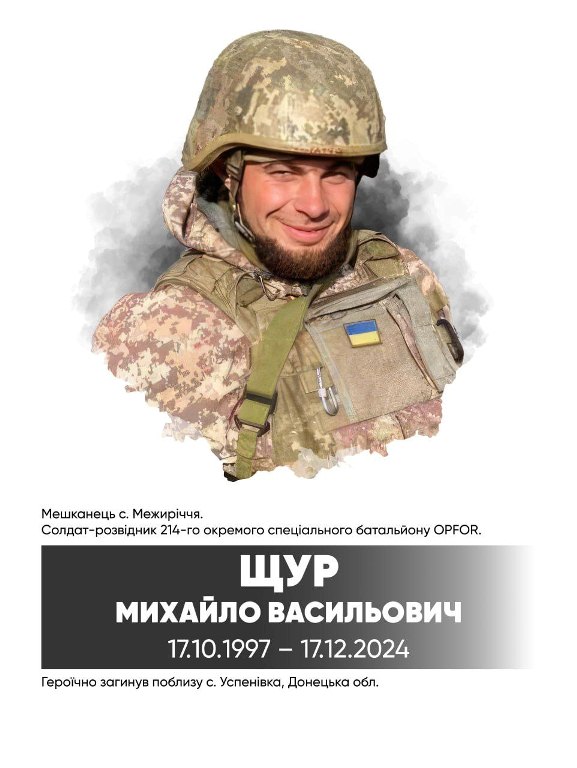 Солдат-розвідник 214-го окремого розвідувального батальйону OPFOR Михайло Щур, захищаючи рідну землю від російських окупантів, загинув 17 грудня 2024 року поблизу населеного пункту Успенівка Покровського району Донецької області.