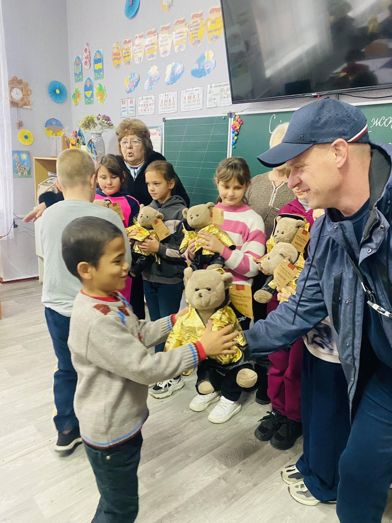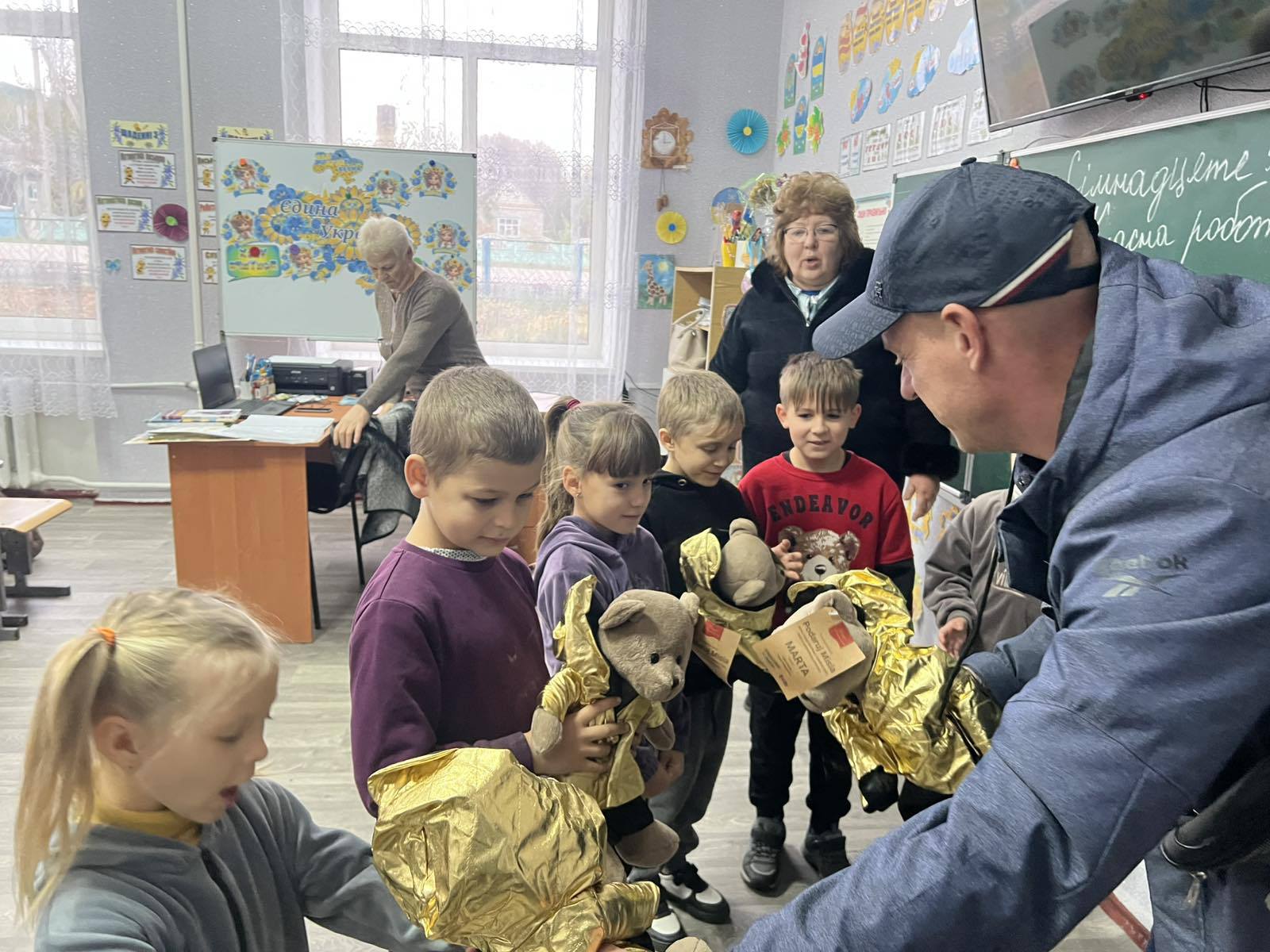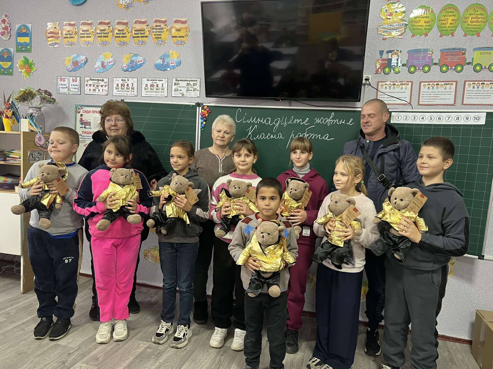 Особливо зворушливим моментом стало привітання учнів початкових класів. Для наймолодших школярів було підготовлено приємний сюрприз – м’які іграшки у вигляді ведмедиків. Ці милі подарунки миттєво викликали щирі посмішки на обличчях дітей, а їхні очі засяяли від захвату. Атмосфера наповнилася радістю та позитивними емоціями, демонструючи, як невеличкий жест турботи може принести стільки щастя.