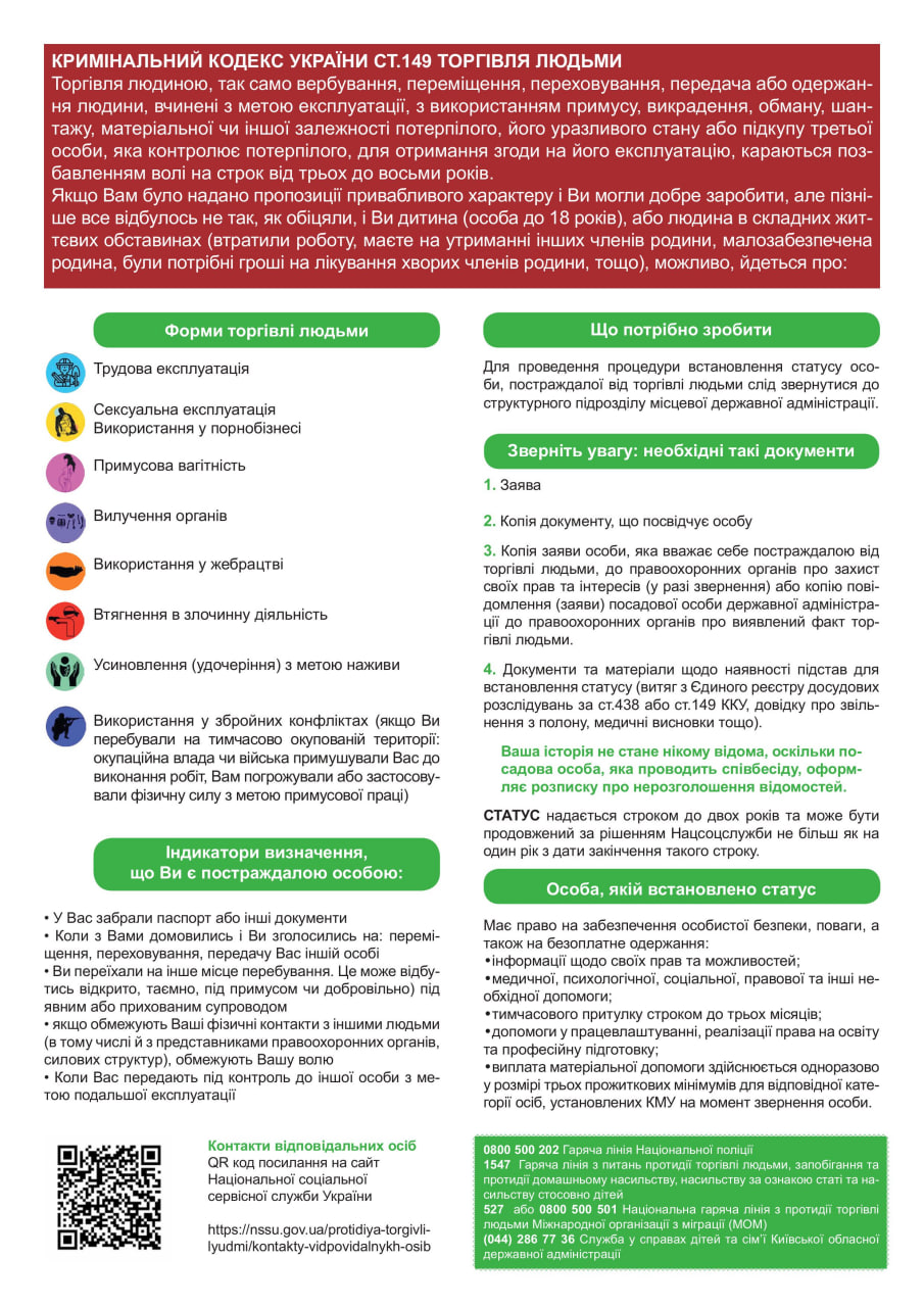 🔹 Пам’ятайте про різноманітність форм торгівлі людьми: окрім трудової та сексуальної експлуатації, слід бути уважними до пропозицій, пов’язаних з жебрацтвом, примусом до злочинної діяльності чи незаконним усиновленням. Особливо це стосується пропозицій, які здаються надто вигідними, щоб бути правдою.