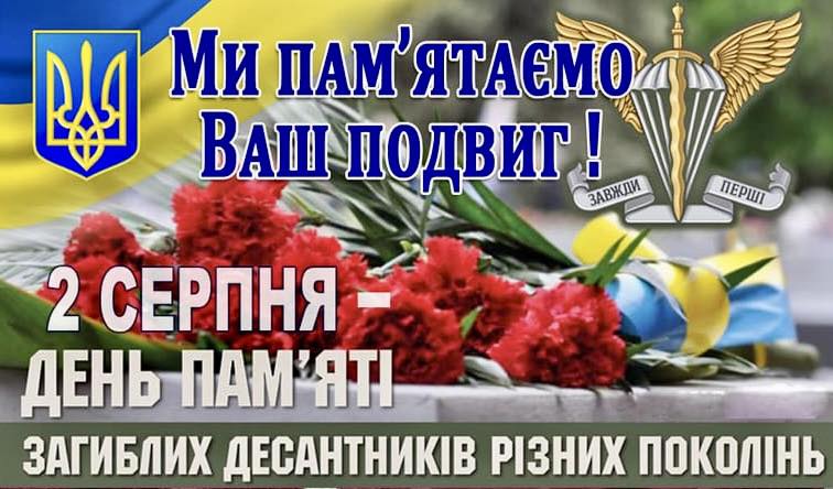 2 серпня Україна вшановує пам’ять загиблих воїнів Десантно-штурмових військ Збройних Сил України. Цей скорботний день присвячений подвигу та жертовності всіх десантників, які віддали найцінніше – своє життя – в боротьбі за незалежність, суверенітет та територіальну цілісність нашої держави.