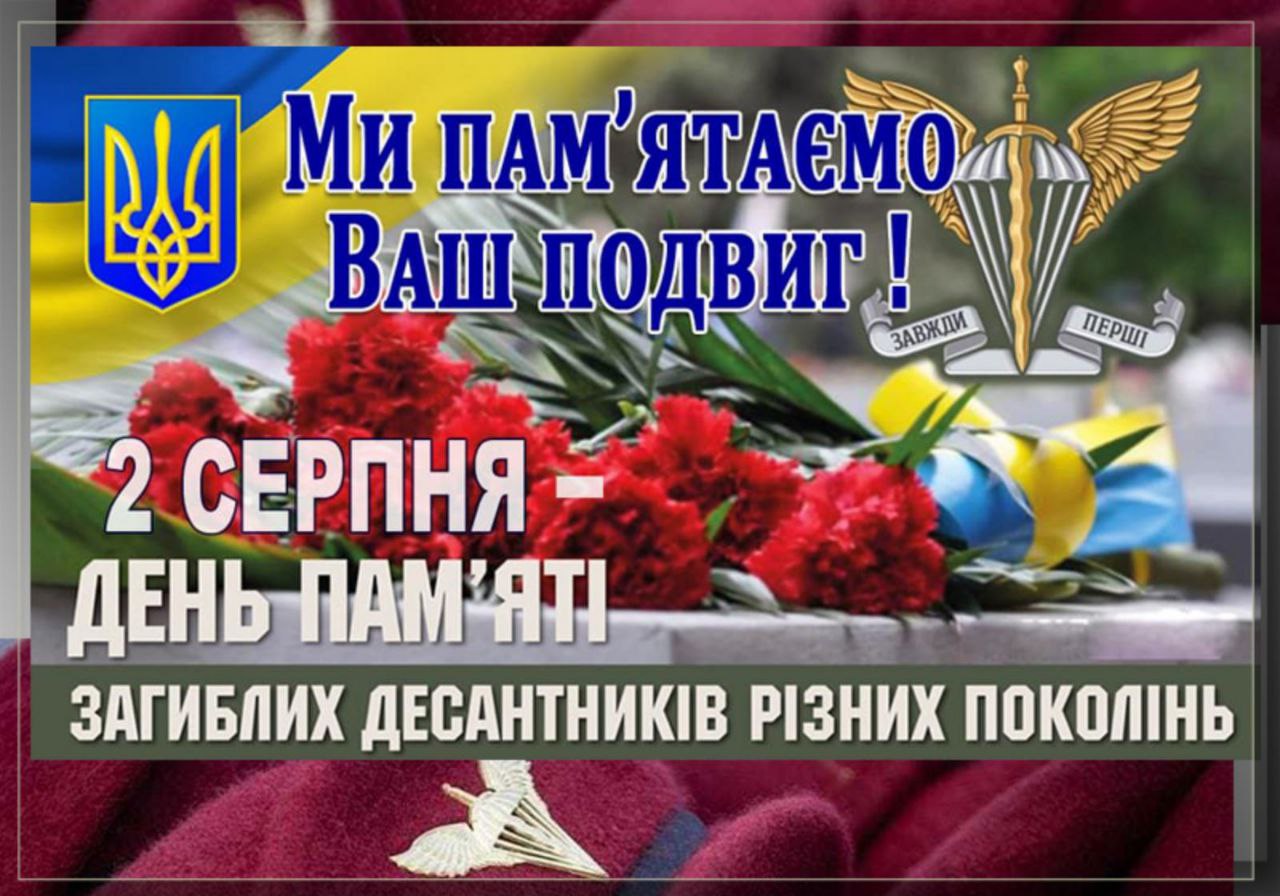 2 серпня — День вшанування пам’яті загиблих військовослужбовців Десантно-штурмових військ Збройних Сил України. Цей день присвячений шані загиблим бойовим побратимам, усім, хто проходив службу в лавах Повітряно-десантних, Аеромобільних, Високомобільних та Десантно-штурмових військах, відважно виконуючи військовий обов’язок задля захисту України та її народу. Ми схиляємо голови в глибокій повазі перед тими, хто не повернувся з бою, перед тими, хто з неба десантувався у вічність. Десантники — це синонім відваги, рішучості та першості у найскладніших завданнях. Вони завжди йшли туди, де було найважче, де небезпека була щоденною реальністю, та платили найвищу ціну — власне життя — за свободу України. Вони — справжні Герої, і кожне їхнє ім’я навіки закарбоване в історії нашої держави. Світла пам’ять та вічна слава героям! Низький уклін.