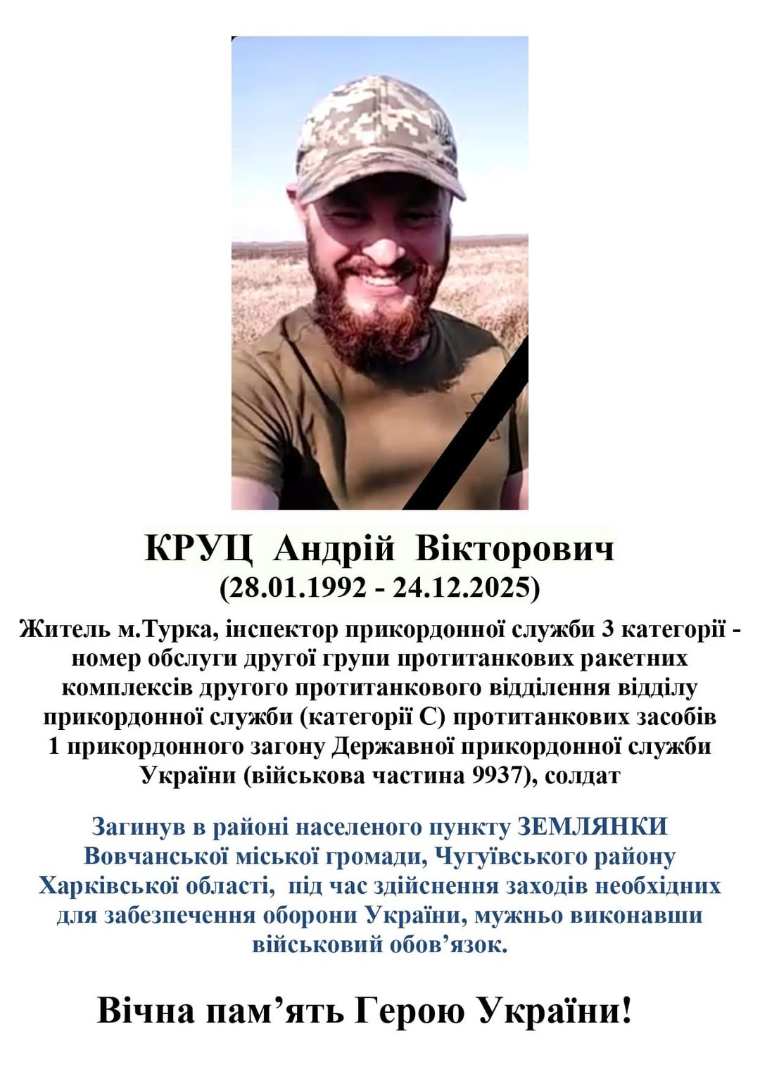 ⚫️ Прощання з Героєм відбудеться цього ж дня 02.01.2026р. 13:00год. (Церква Різдва Христового м.Турка вул.І.Франка “Ровінь”).