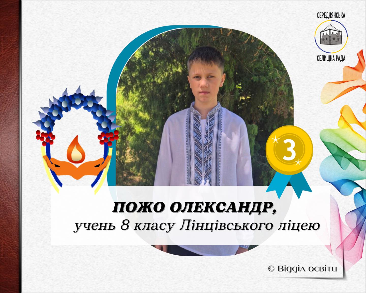 📃🖋️ Вітаємо та висловлюємо щиру вдячність Олександру за наполегливість та проявлений талант, а вчителю української мови та літератури Голич Наталії Юріївні – за професіоналізм та результативну працю.