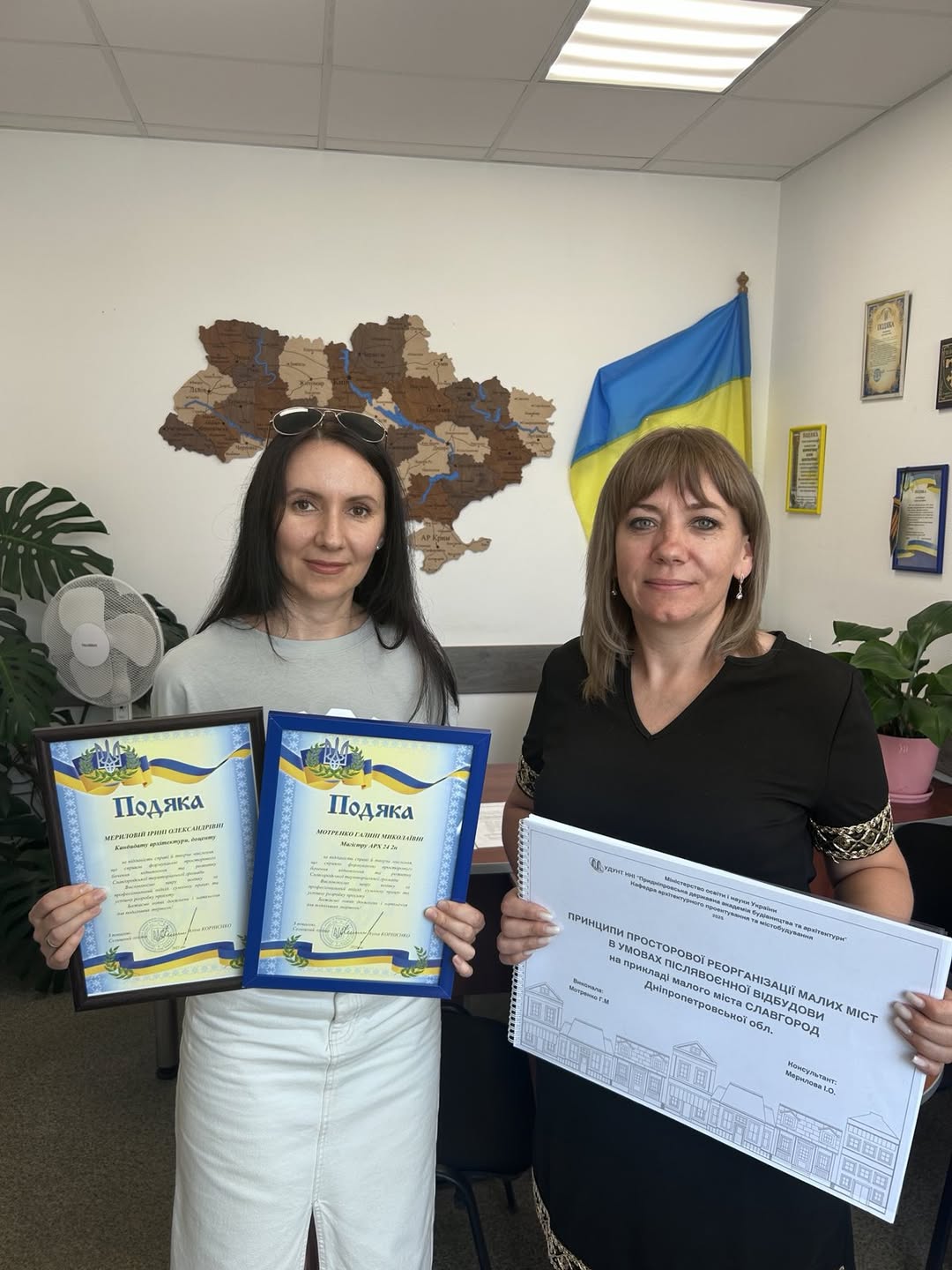 20 серпня 2025 року студентка кафедри архітектурного проєктування та містобудування Українського державного університету науки і технологій, Навчально-наукового інституту «Придніпровська державна академія будівництва та архітектури», Галина МОТРЕНКО представила голові Славгородської селищної ради Аліні КОРНІЄНКО розроблені концептуальні проєктні рішення. Ці рішення спрямовані на реорганізацію території селища Славгород в умовах повоєнної відбудови України.