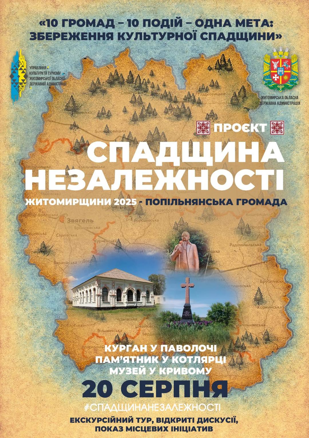 📅 20 серпня 2025 року, в серці Попільнянської громади, розпочнеться важливий проєкт «Історико-краєзнавчий, культурно-просвітницький та музейний простір». Ця ініціатива є частиною обласного проєкту «Спадщина Незалежності», який присвячений відзначенню Дня Незалежності України. Цей культурно-просвітницький проєкт має на меті глибше дослідити та представити історію й культурну спадщину регіону, а також виявити актуальні виклики, що стоять перед громадою, та запропонувати дієві шляхи їх вирішення. Маршрут проєкту охоплює 16 унікальних локацій, серед яких село Котлярка, селище Попільня та село Паволоч. Учасники матимуть змогу зануритися у багату історію краю, ознайомитися з його культурною спадщиною та взяти участь у дискусіях щодо розвитку громади. Це чудова нагода для місцевих жителів та гостей дізнатися більше про свій край та долучитися до його майбутнього. До участі у заході запрошені провідні краєзнавці, досвідчені фахівці обласних установ, представники сусідніх громад, а також старости Попільнянської громади. Їхній досвід та знання допоможуть зробити цей проєкт по-справжньому цінним та інформативним. Ми впевнені, що «Історико-краєзнавчий, культурно-просвітницький та музейний простір» стане яскравою подією, яка сприятиме збереженню історичної пам’яті та розвитку Попільнянської громади.