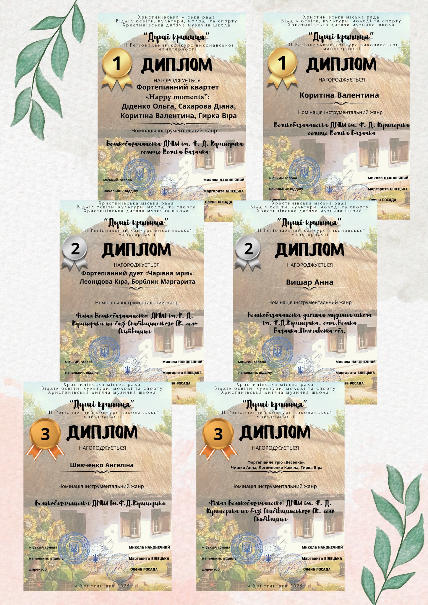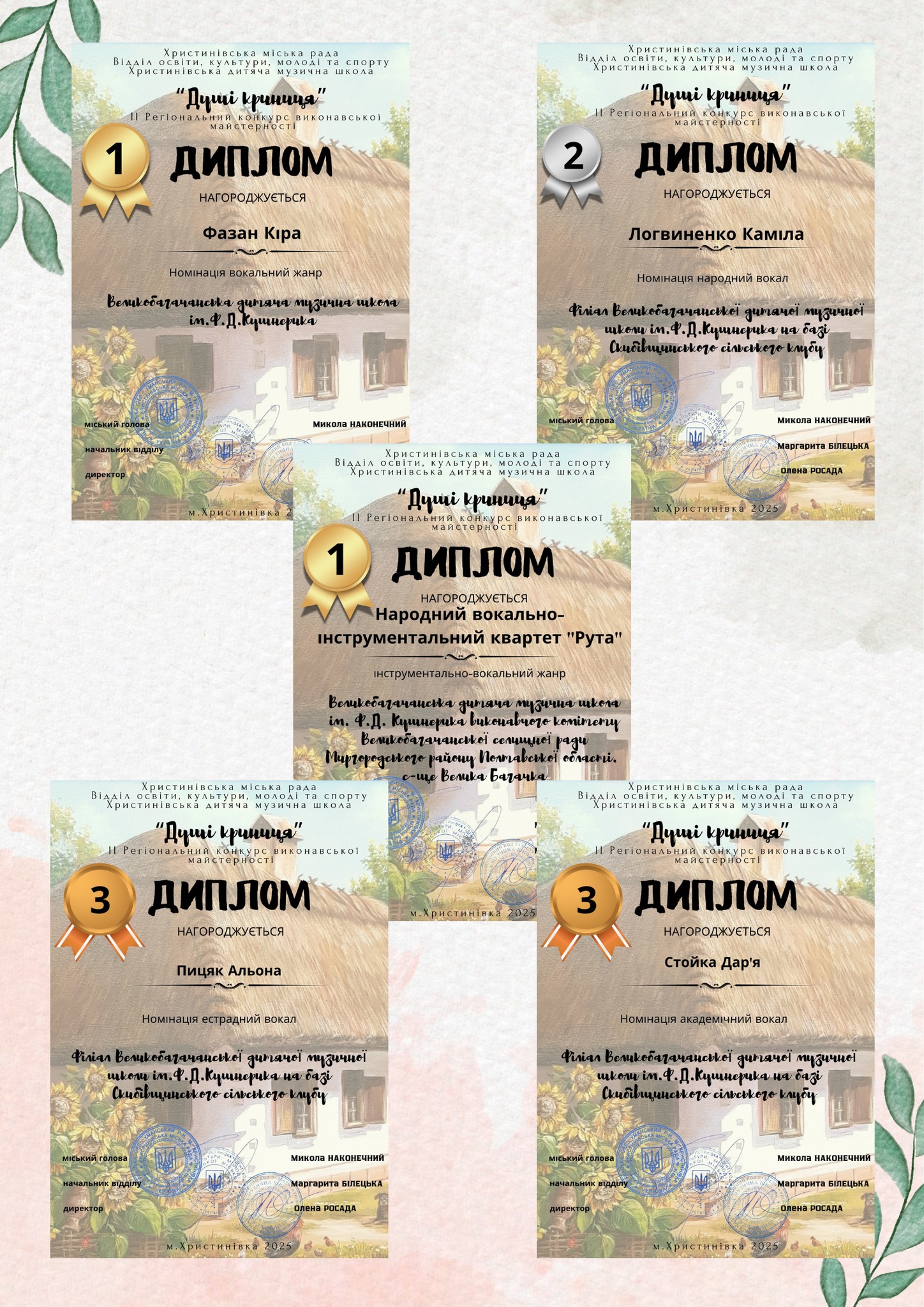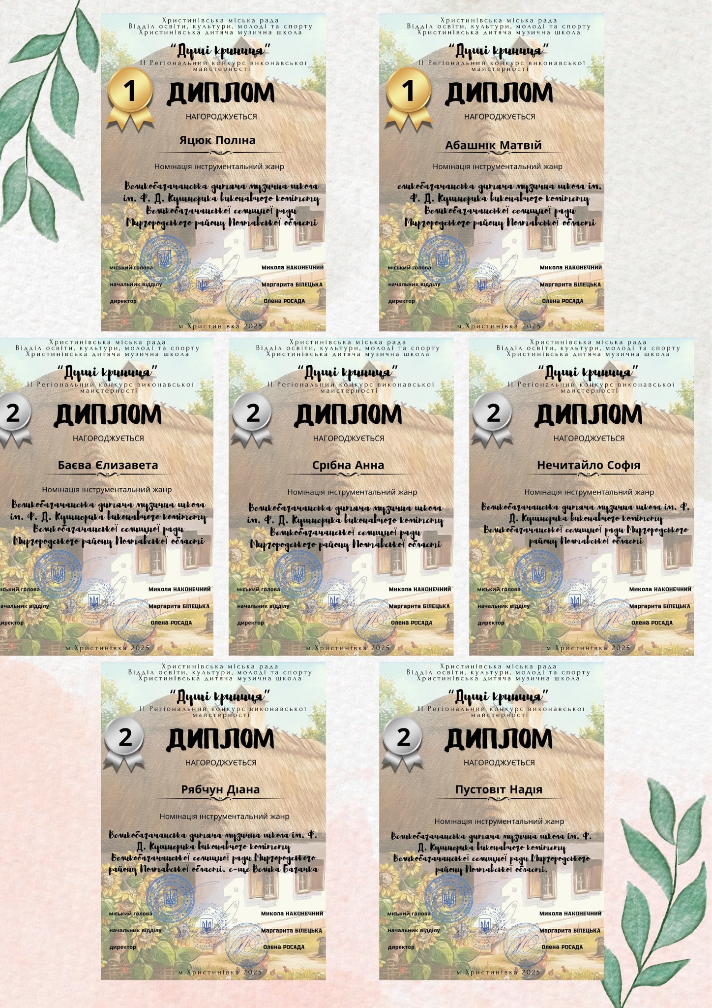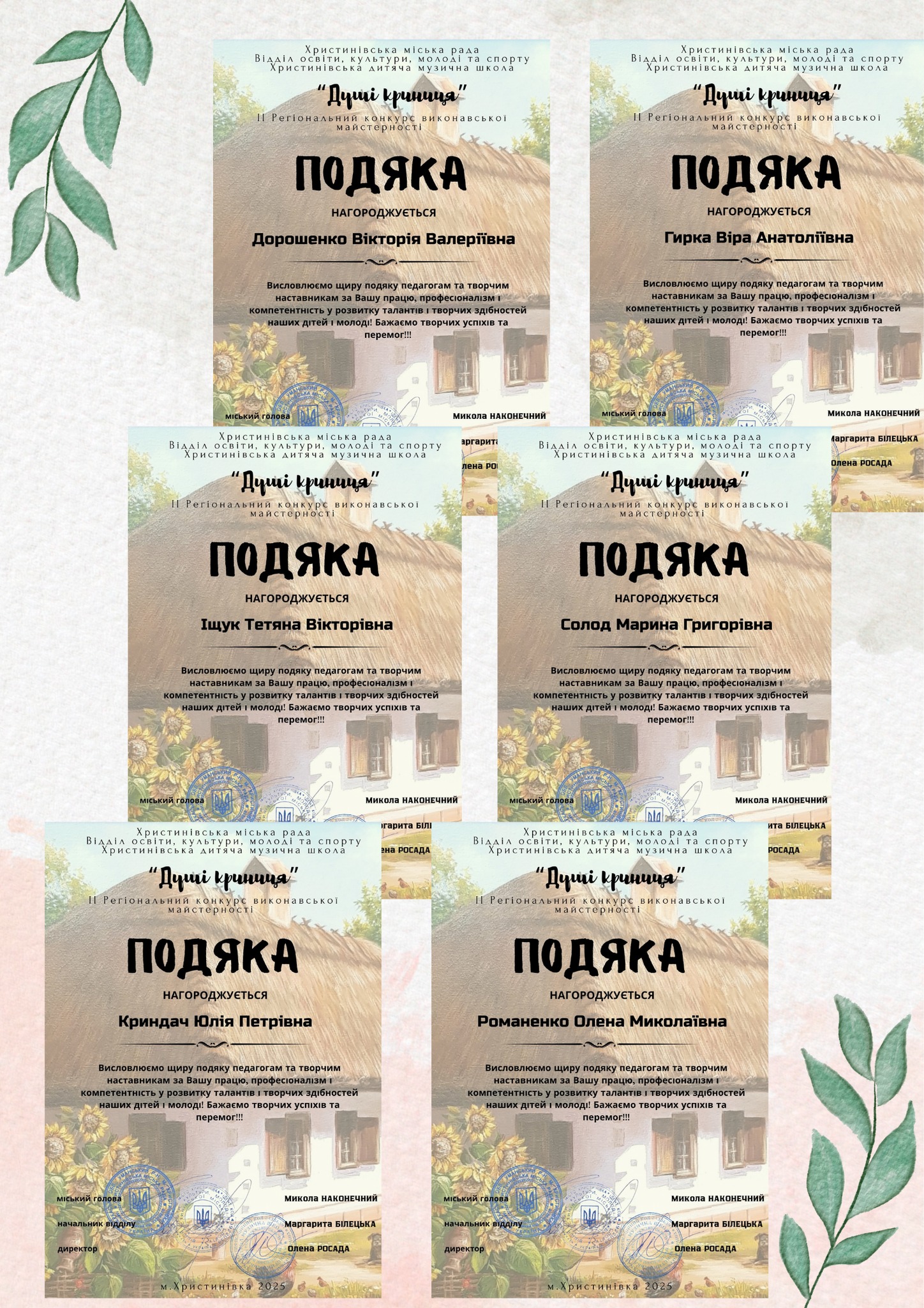 20-27 травня 2025 року дистанційно відбувся ІІ Регіональний учнівсько-виконавський конкурс “Душі криниця” на базі Христинівської дитячої музичної школи (Черкаська область).