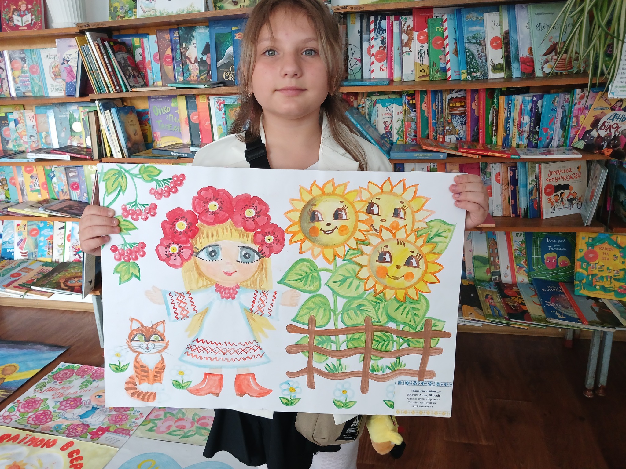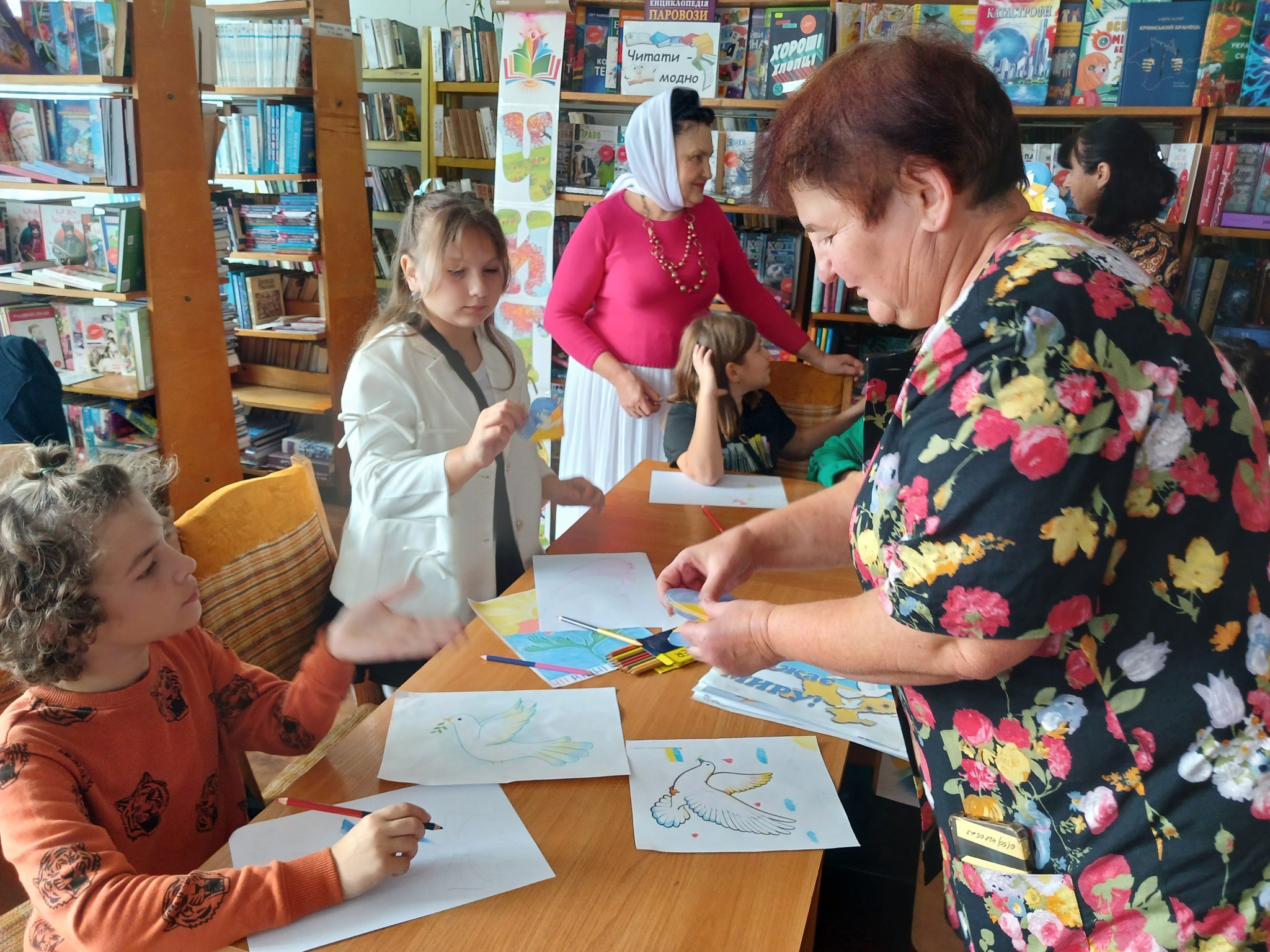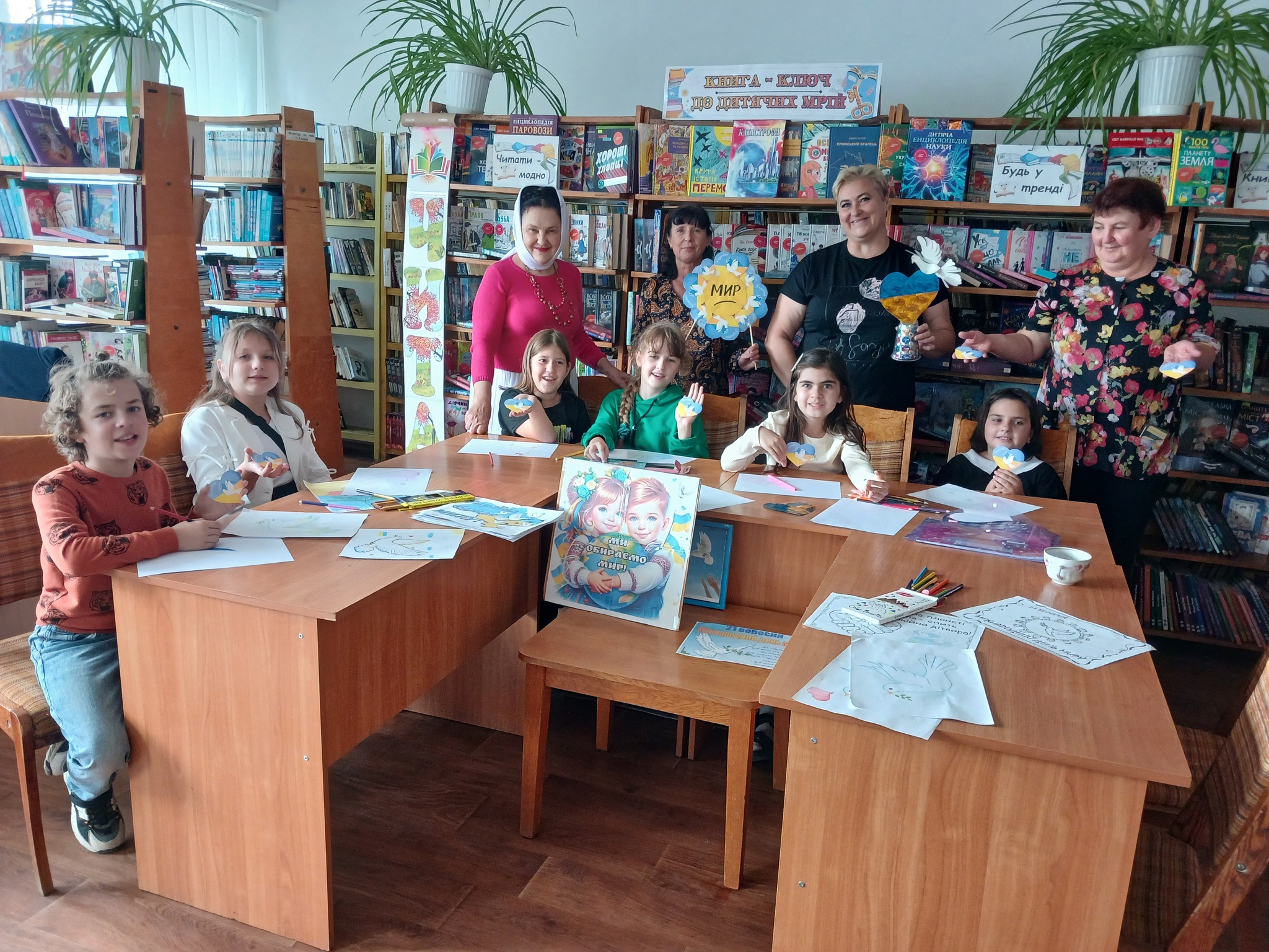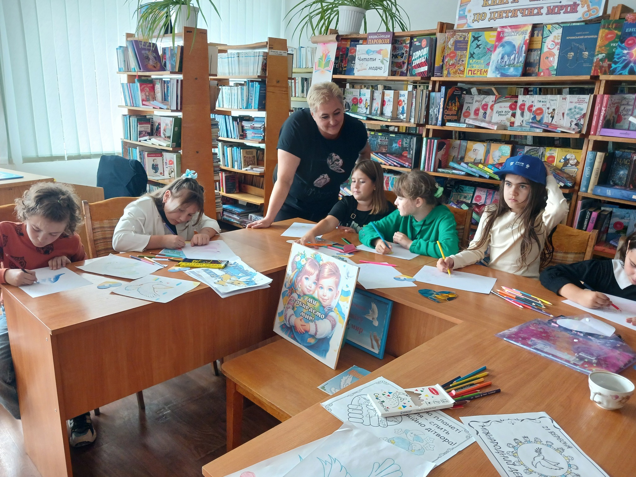 До бібліотеки завітали юні таланти разом зі своєю наставницею, керівником зразкової студії «Берегиня» Тальнівського будинку дітей та юнацтва, Надією Маляренко. Діти представили свої роботи, що яскраво відображають їхні мрії про мир. Кожен малюнок – це кольорове вираження дитячих надій на безпечне небо, щасливих усмішок людей та процвітаючу Україну. Тема миру стала джерелом натхнення для юних художників, які вклали душу у свої творіння.
