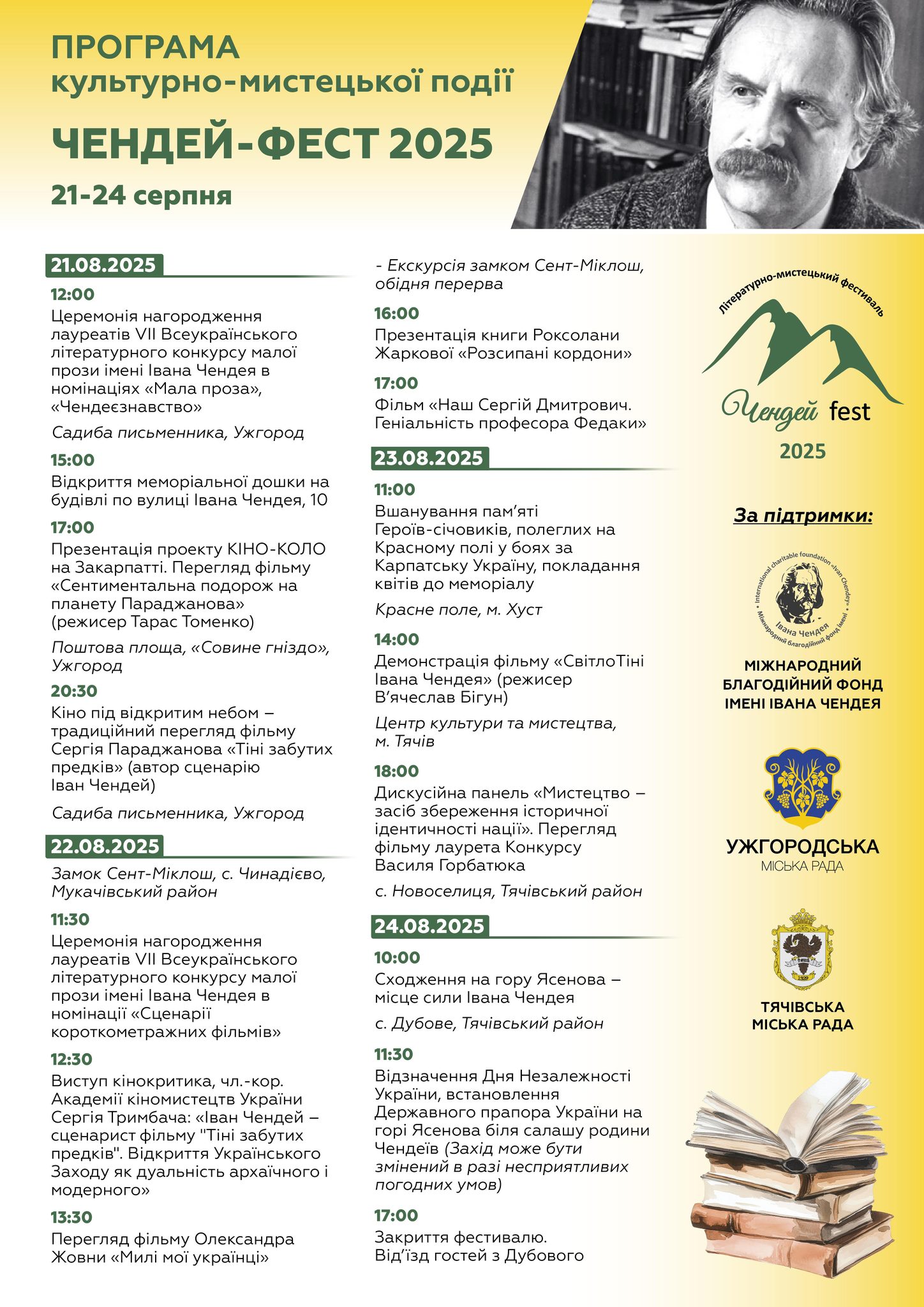 З 21 по 24 серпня 2025 року Закарпаття перетвориться на епіцентр культурних подій завдяки шостому літературно-мистецькому фестивалю «Чендей-фест». Цей щорічний захід присвячений популяризації творчості видатного українського прозаїка, драматурга та громадського діяча ХХ століття Івана Чендея. Фестиваль охопить кілька міст і селищ регіону, зокрема Ужгород, Чинадієво, Хуст, Тячів, Новоселицю та Дубове, об’єднуючи ідею «Мистецтво – засіб збереження історичної ідентичності нації».