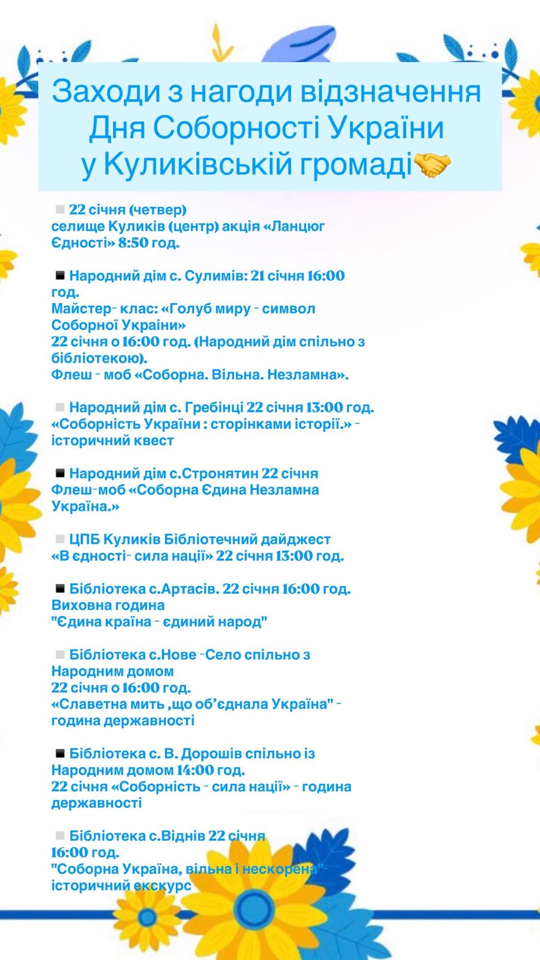 🇺🇦22 січня День Соборності України — це нагадування про те, що наша сила в єдності, а майбутнє держави починається з пам’яті про шлях, яким ми пройшли разом.🤝 Заходи з нагоди відзначення у Куликівській громаді⬇️
