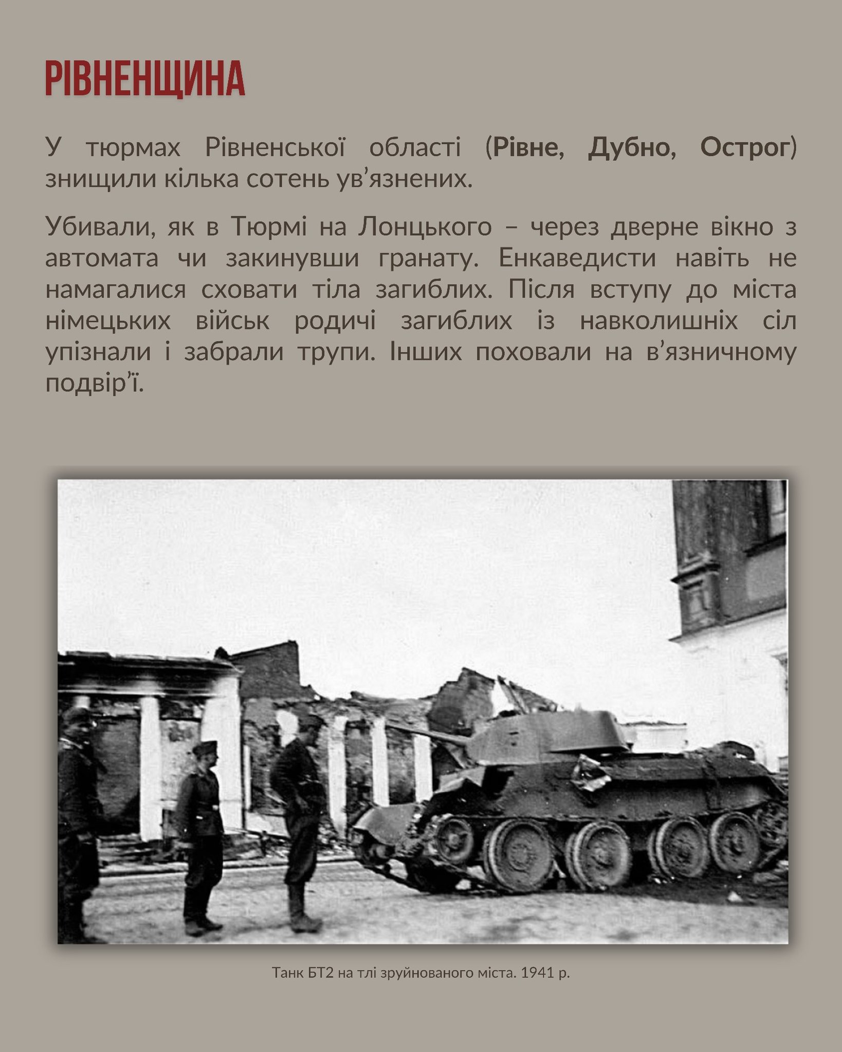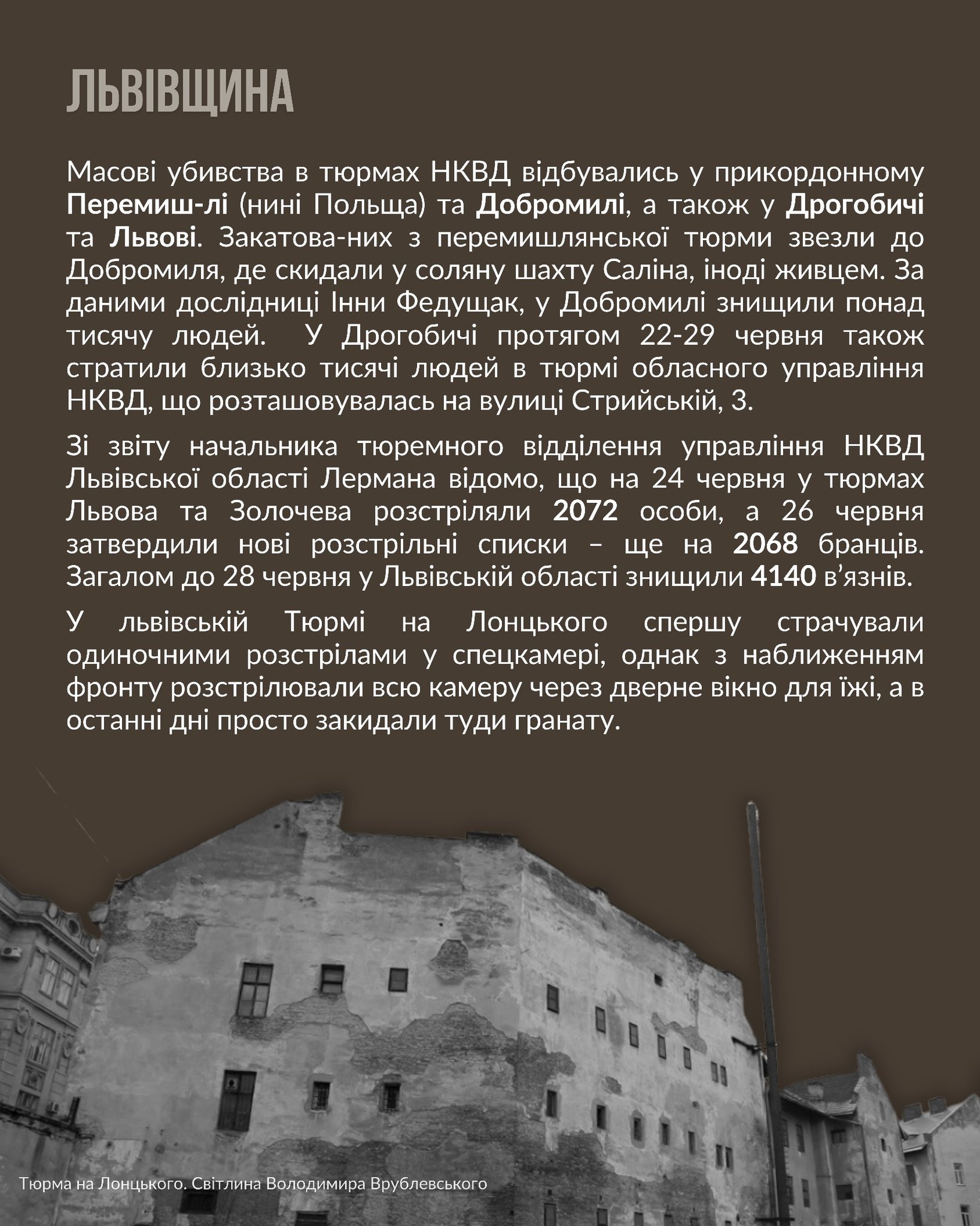 Для українців червень 1941 року став подвійною трагедією. Поки нацистський режим бомбардував українські населені пункти, більшовицький режим вдався до масових страт в’язнів у тюрмах.