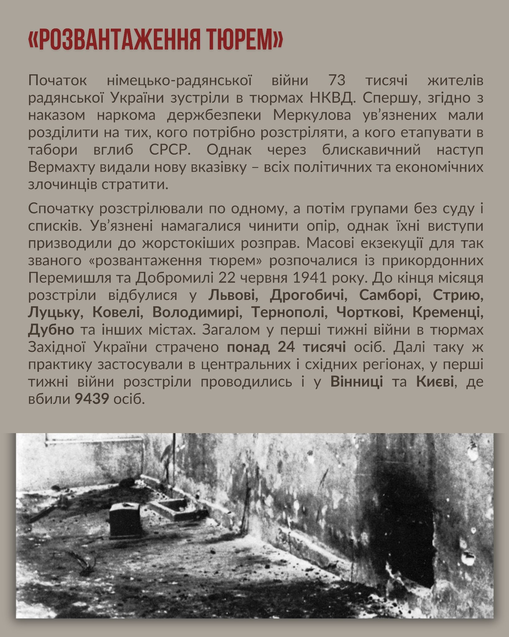 Жахливі події червня-липня 1941 року розгорталися у тюрмах Львова, Луцька, Дубна, Тернополя, Рівного, Станіслава (нині Івано-Франківська) та багатьох інших міст. В’язнів розстрілювали у камерах, подвір’ях, підвалах, іноді навіть закопуючи живцем. Свідчення очевидців та архівні документи, доступні сьогодні, розкривають неймовірну жорстокість, з якою були вчинені ці злочини НКВС. Тіла загиблих часто залишали без поховання або ховали у братських могилах, намагаючись приховати масштаби трагедії. Деякі з цих місць залишалися невідомими протягом десятиліть, поки не були виявлені після розпаду Радянського Союзу.