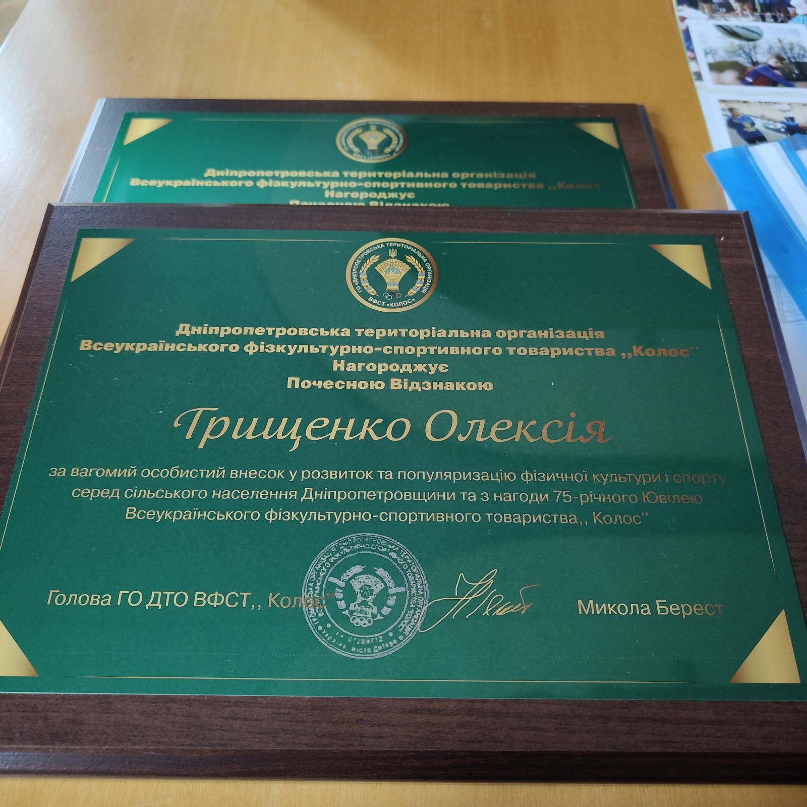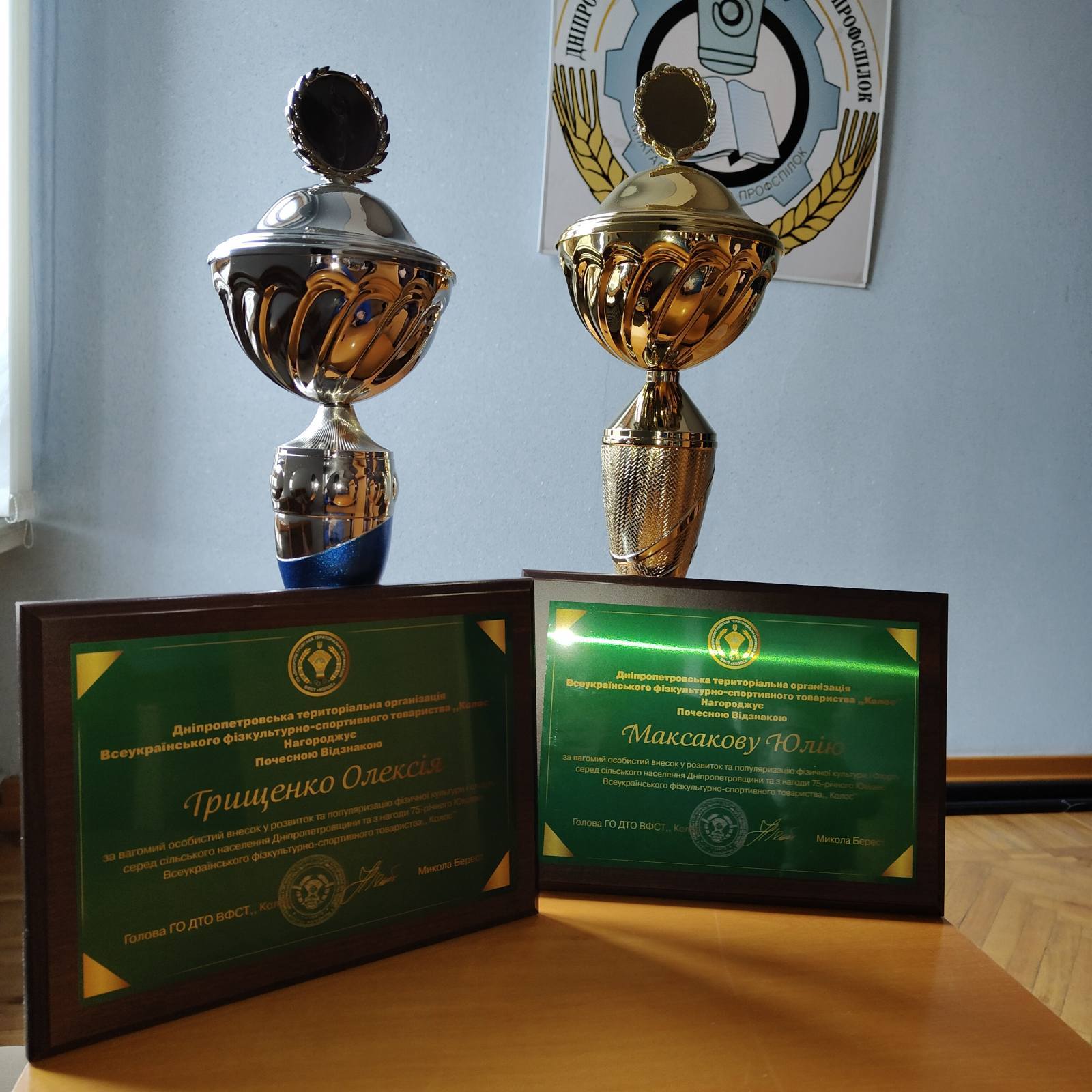 за вагомий особистий внесок у розвиток і популяризацію фізичної культури та спорту серед сільського населення Дніпропетровщини;