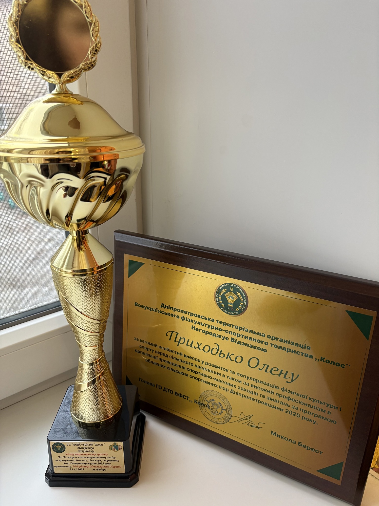 🔹 Кубок за ІІІ місце в загальному заліку за програмою обласних міських спортивних ігор Дніпропетровщини 2025 року, присвячених 34-й річниці Незалежності України.