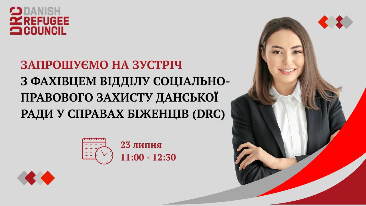 🔔 23 липня, у місті Вознесенськ, відбудеться важлива зустріч із фахівцем відділу соціально-правового захисту від Данської ради у справах біженців / DRC. Це чудова нагода отримати комплексну індивідуальну допомогу та цінні консультації. 📍 Місце зустрічі: вул. Софійська, 1. ⏰ Час: з 11:00 до 12:30.