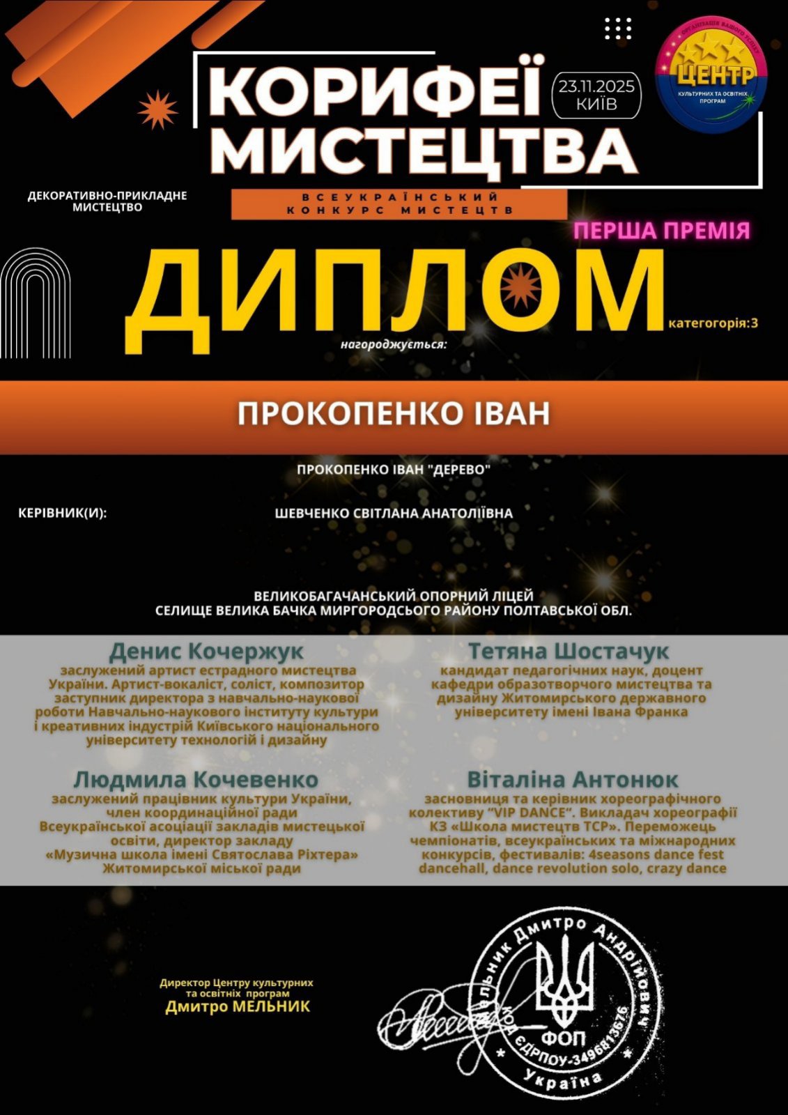 Учень 7-Б класу Великобагачанського опорного ліцею Іван Прокопенко (учитель технологій Світлана Шевченко) здобув диплом Першої премії у номінації “Декоративно-прикладне мистецтво”.