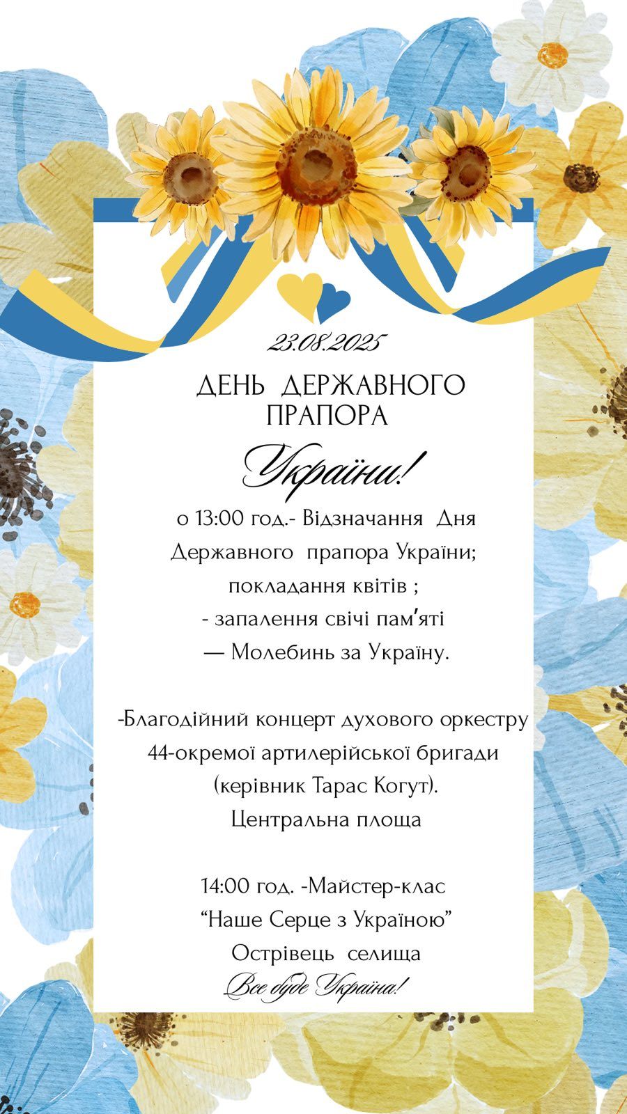 23 серпня 2025 року о 13:00 на центральній площі селища розпочнуться урочисті заходи з нагоди Дня Державного Прапора України та Дня Незалежності України під гаслом «Єдина! Вільна! Неподільна!»💙💛.