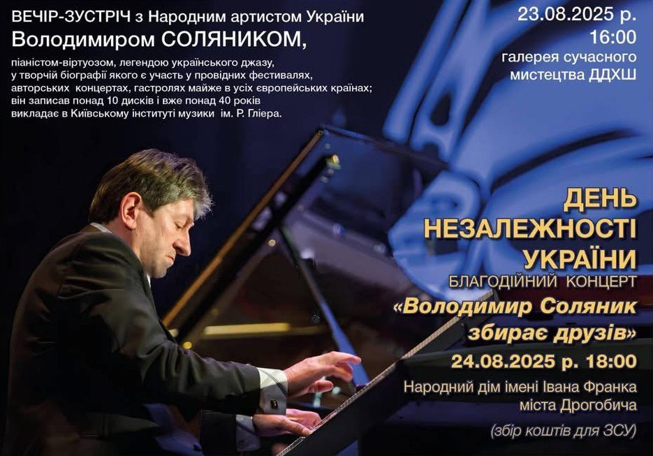 Ці два дні у Дрогобичі стануть незабутніми для всіх, хто цінує справжнє мистецтво та бажає підтримати нашу державу. Відчуйте магію джазу, підтримайте українських героїв – приходьте на зустріч із Володимиром Соляником!