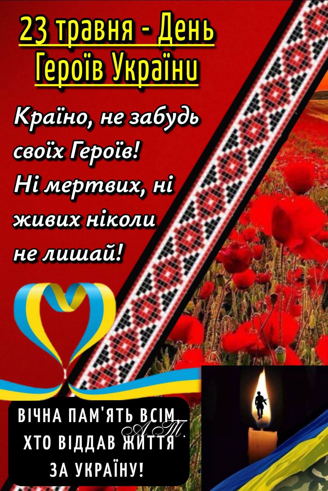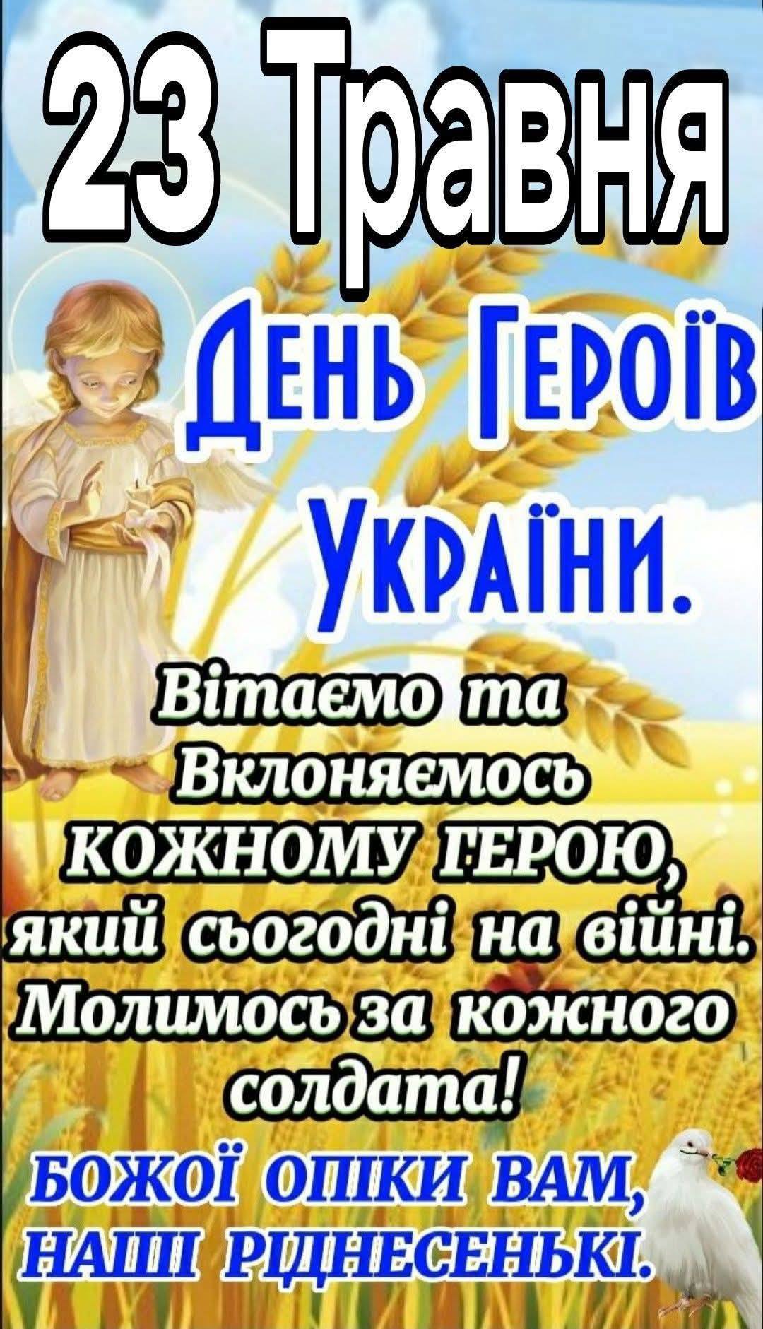 23 травня – День Героїв. Це день, коли ми схиляємо голови перед мужністю та відвагою тих героїв, які боронили і продовжують захищати нашу рідну країну. Пам’ять про їхні подвиги назавжди залишиться в наших серцях, а живим героям висловлюємо безмірну вдячність і повагу. Саме завдяки героям Україна залишається сильною та незалежною!