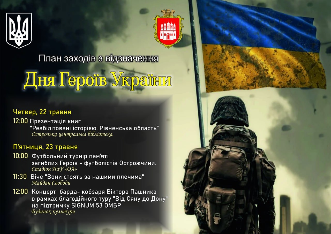 В Острозі відбудеться ряд заходів, присвячених відзначенню Дня Героїв України. Ці заходи мають на меті вшанувати пам’ять загиблих воїнів та висловити підтримку тим, хто зараз на передовій. Ми запрошуємо всіх мешканців та гостей міста долучитися до цих важливих подій.