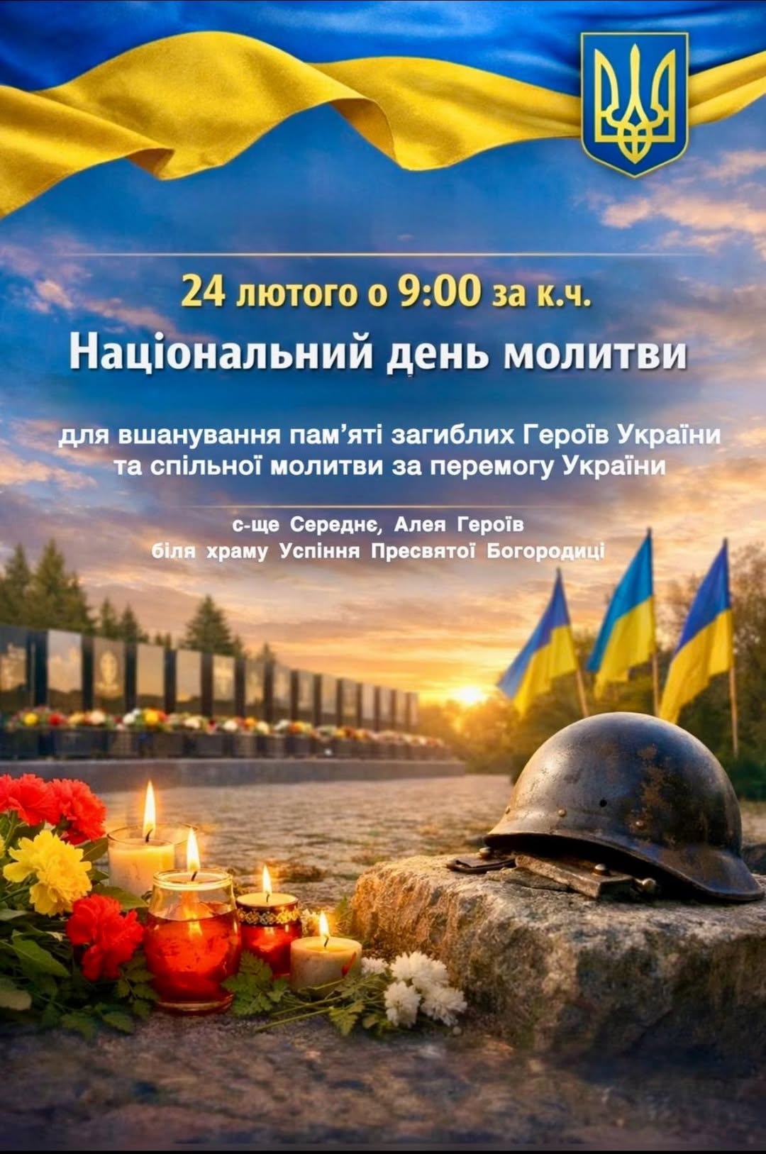 🗓️ 24 лютого 2026 року, о 9:00 за київським часом, Україна вшанує пам’ять своїх загиблих Героїв Національним днем молитви. Ця знаменна подія, що має глибоке духовне значення, збереться біля храму «Успіння Пресвятої Богородиці» на Алеї Героїв у селищі Середнє. Це місце, яке вже стало символом мужності та жертовності, прийме жителів громади та всіх небайдужих, хто прагне долучитися до спільної молитви за перемогу України.