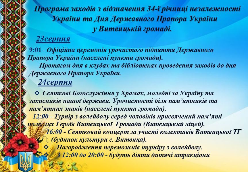 Витвицька сільська рада територіальної громади радо запрошує всіх мешканців та гостей долучитися до святкових заходів, присвячених цим знаменним датам. Ми підготували насичену програму, яка дозволить кожному відчути гордість за свою країну та її багату історію.