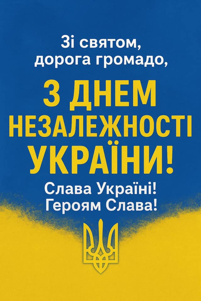 24 серпня – це не просто дата в календарі, а день, що нагадує про віковічне прагнення українців жити у вільній, сильній та незалежній державі. Це день глибокої гордості й щирої вдячності тим, хто виборював і продовжує виборювати наше право бути господарями на рідній землі. Незалежність – це найвища цінність для кожного народу, виборювана козацькою відвагою, нескореністю борців за волю України, жертовністю Героїв Небесної Сотні. Сьогодні цю свободу захищають мужні воїни на фронті, завдяки яким ми можемо жити під мирним небом, плекати традиції, виховувати дітей та мріяти про щасливе майбутнє. У цей знаменний день ми вшановуємо пам’ять полеглих героїв, які віддали життя за Україну. Висловлюємо глибоку вдячність нашим Захисникам і Захисницям, що боронять нашу свободу, волонтерам, медикам та всім небайдужим громадянам, чия щоденна праця наближає перемогу. Нехай єдність та взаємопідтримка стануть нашою спільною силою, а непохитна віра в Україну додасть нам мужності й наснаги. Бажаємо кожній українській родині миру, добробуту, міцного здоров’я та Божого благословення. Хай у наших серцях завжди живе любов до рідної землі, а синьо-жовтий стяг майорить як символ гордості та надії для майбутніх поколінь. Слава Україні! Героям Слава! Слава нашій Незалежній Державі!