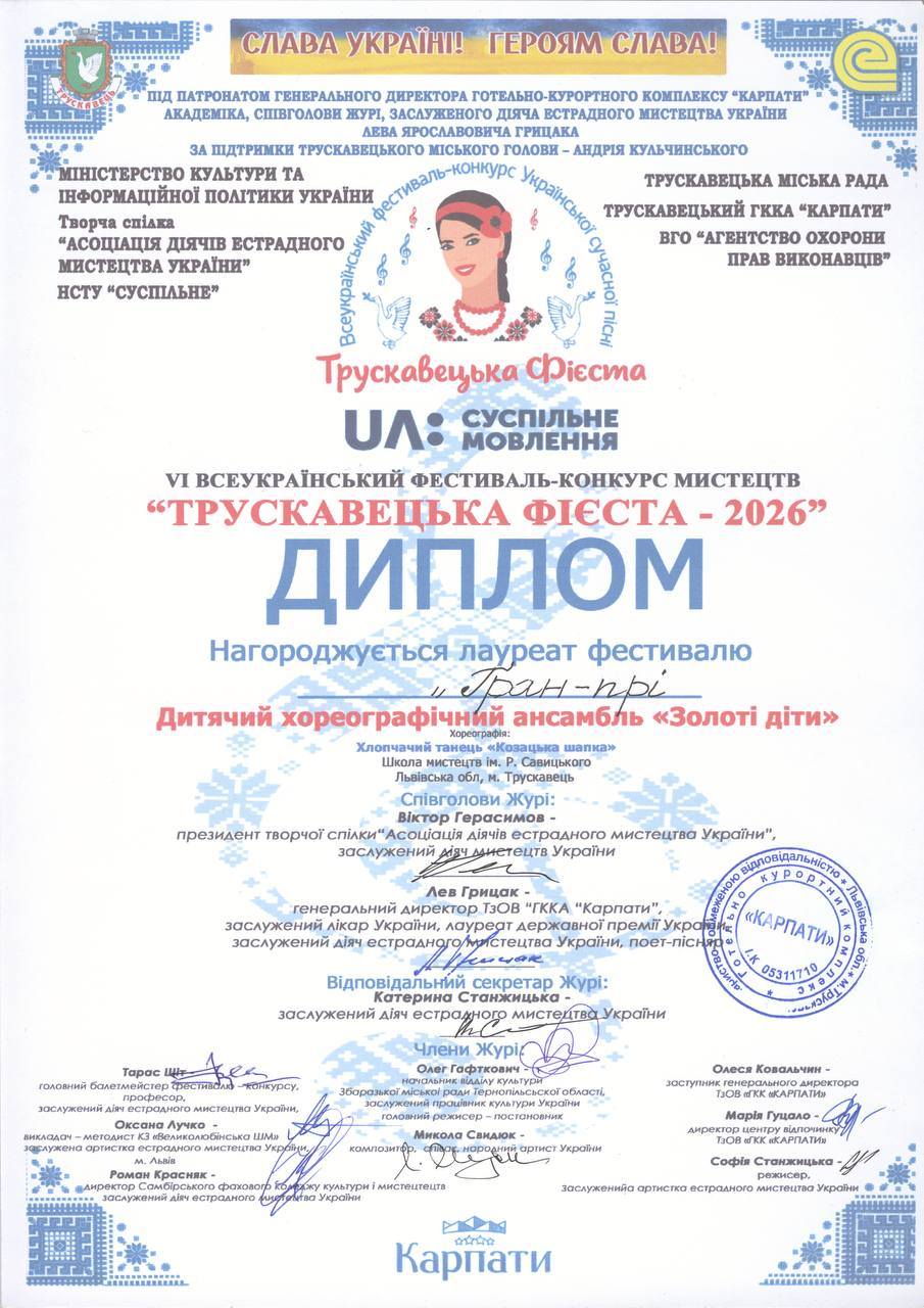 Хореографічний ансамбль “Золоті діти” (кер. Олександр та Ніна Мойсеєнки, Наталія Стрельник) Трускавецької школи мистецтв ім. Р. Савицького виборов Гран-Прі (танцювальний номер “Козацька шапка”) та три перші місця.