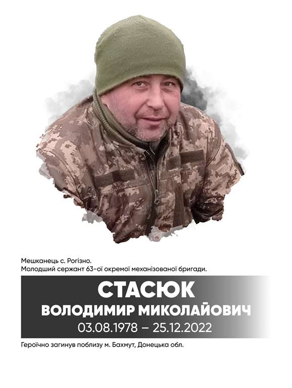 Командир відділення автомобільного взводу, молодший сержант 63-ї окремої механізованої бригади, 44–річний Герой Володимир Стасюк загинув у боях з російськими окупантами 25 грудня 2022 року поблизу східної околиці міста Бахмут Донецької області.