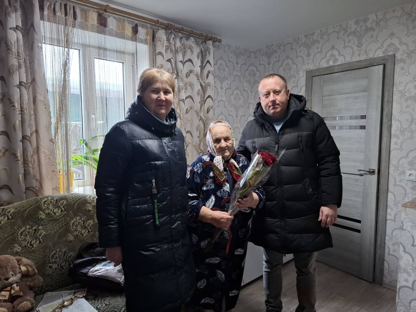 З побажаннями здоров’я, миру, добра та благополуччя вітали іменинницю голова селищної ради Сергій Сидоренко та директор тер центру Надія Ігнатенко.