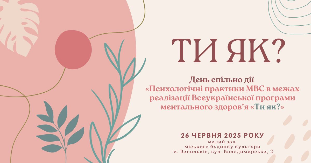 26 червня 2025 року о 14:00 год. у малому залі Васильківського міського будинку культури відбудеться День спільної дії «Психологічні практики МВС» в межах реалізації Всеукраїнської програми ментального здоров’я «Ти як?», започаткованої за ініціативи Першої леді України Олени Зеленської.